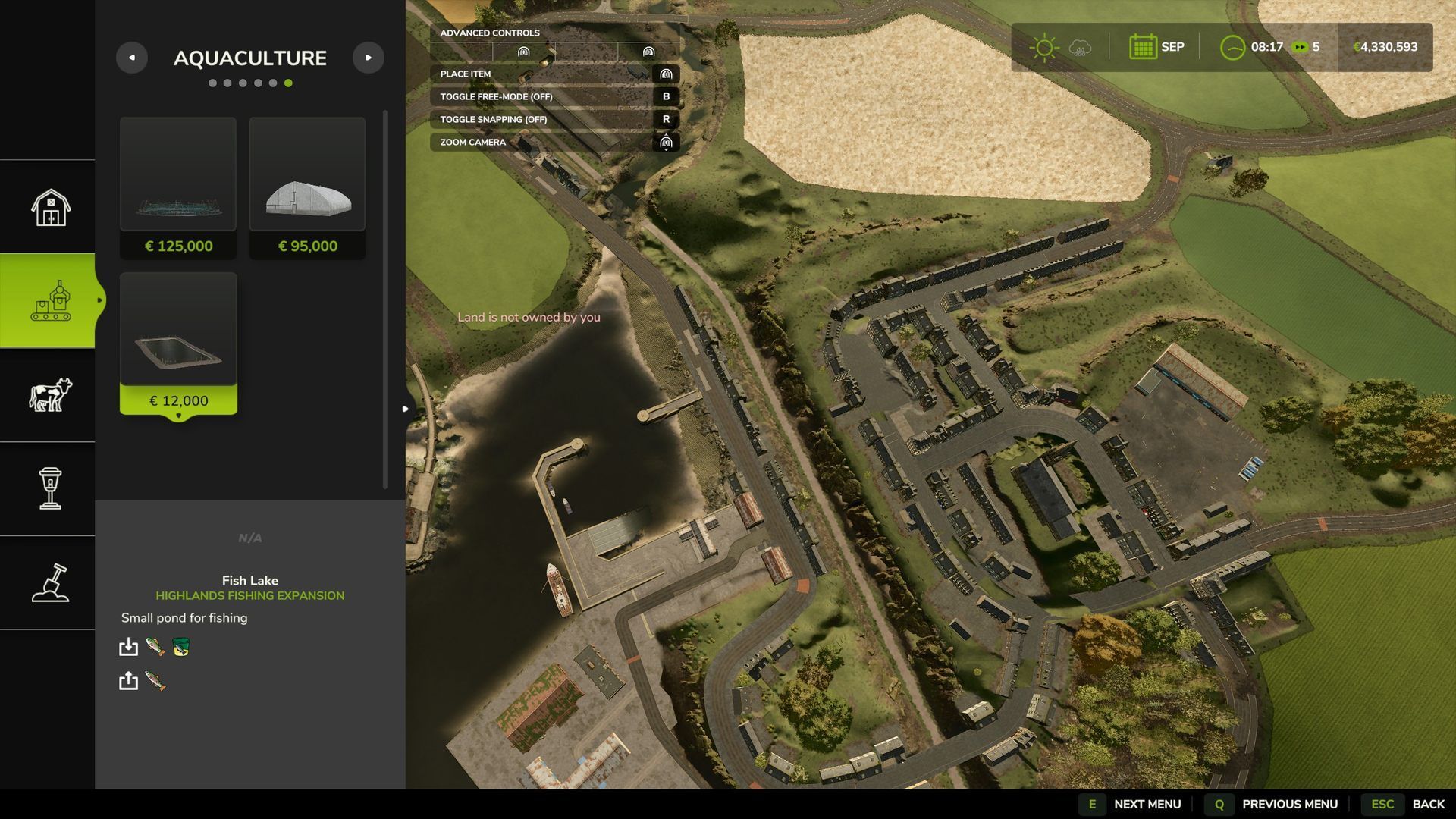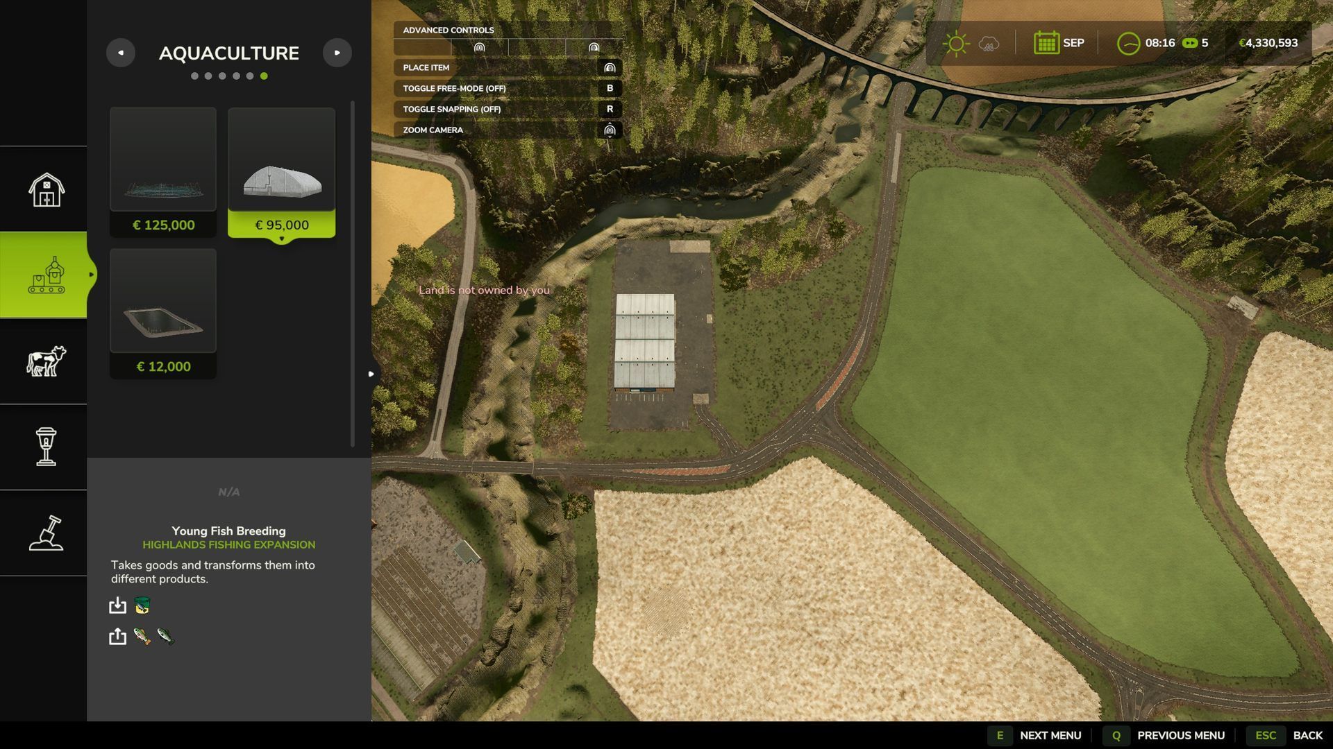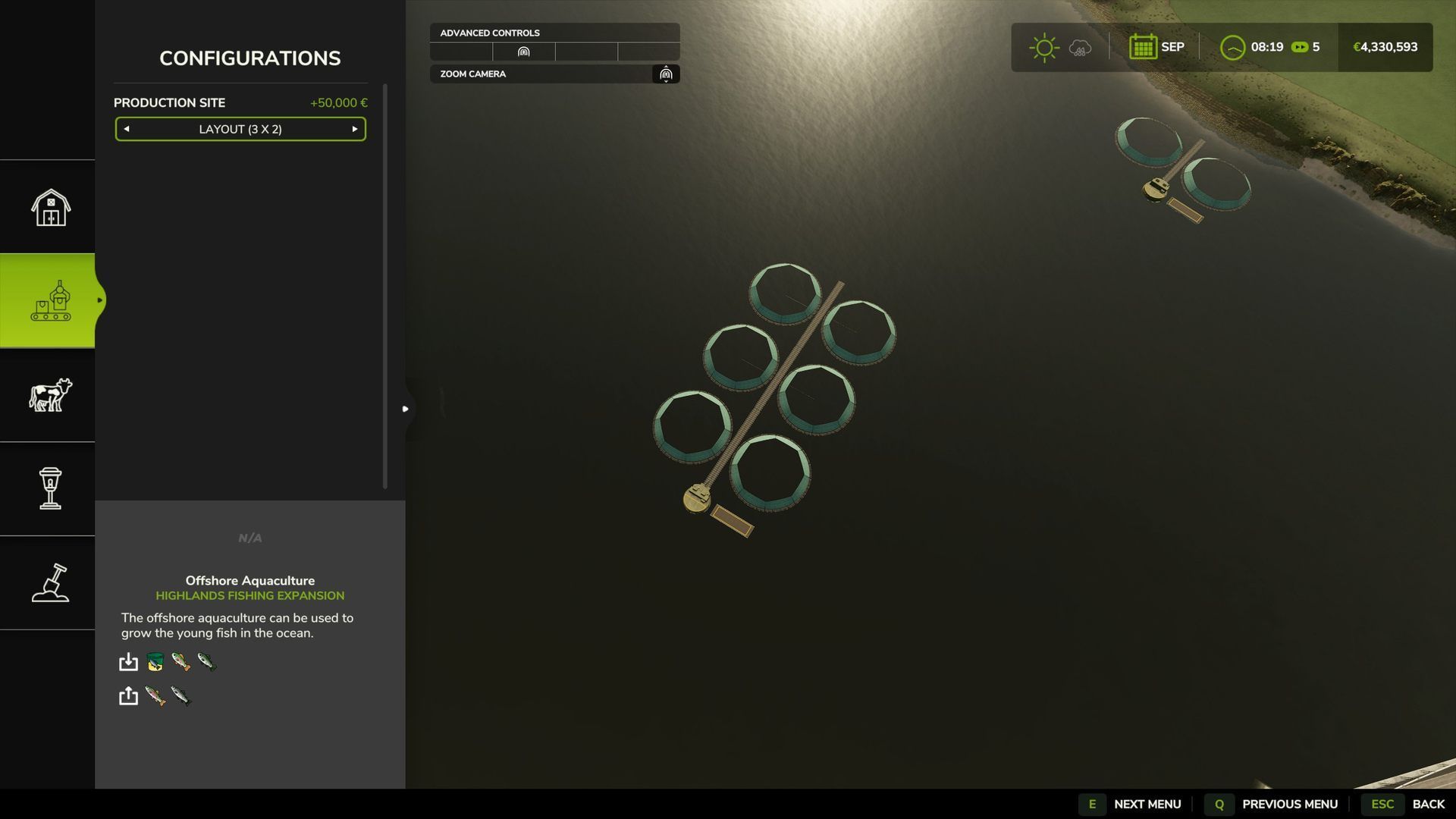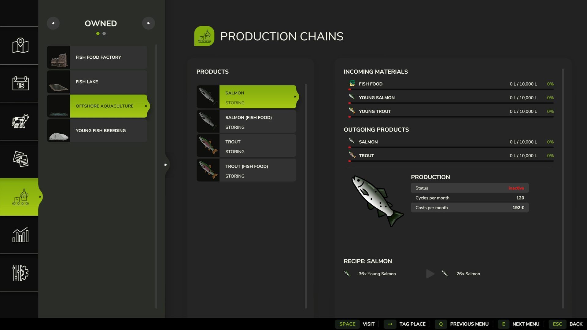 Hodowla łososi wymaga już inwestycji w dużą Farmę Rybną, którą musicie umieścić na morzu (dostępne na mapie Kinlaig). Koszt morskiej farmy to 125000 Euro, ale możecie rozbudować ją o dodatkowe segmenty, po 25 tysięcy za każdą kolejną parę.