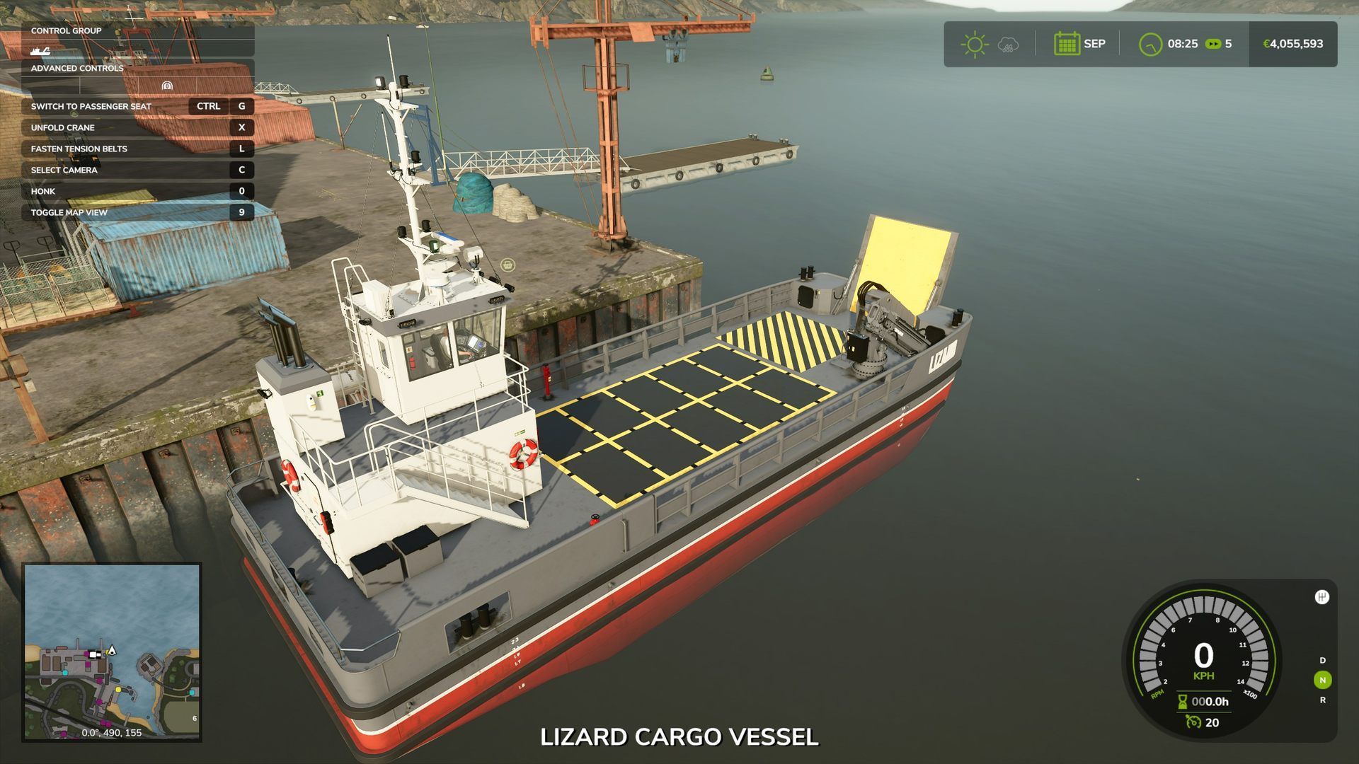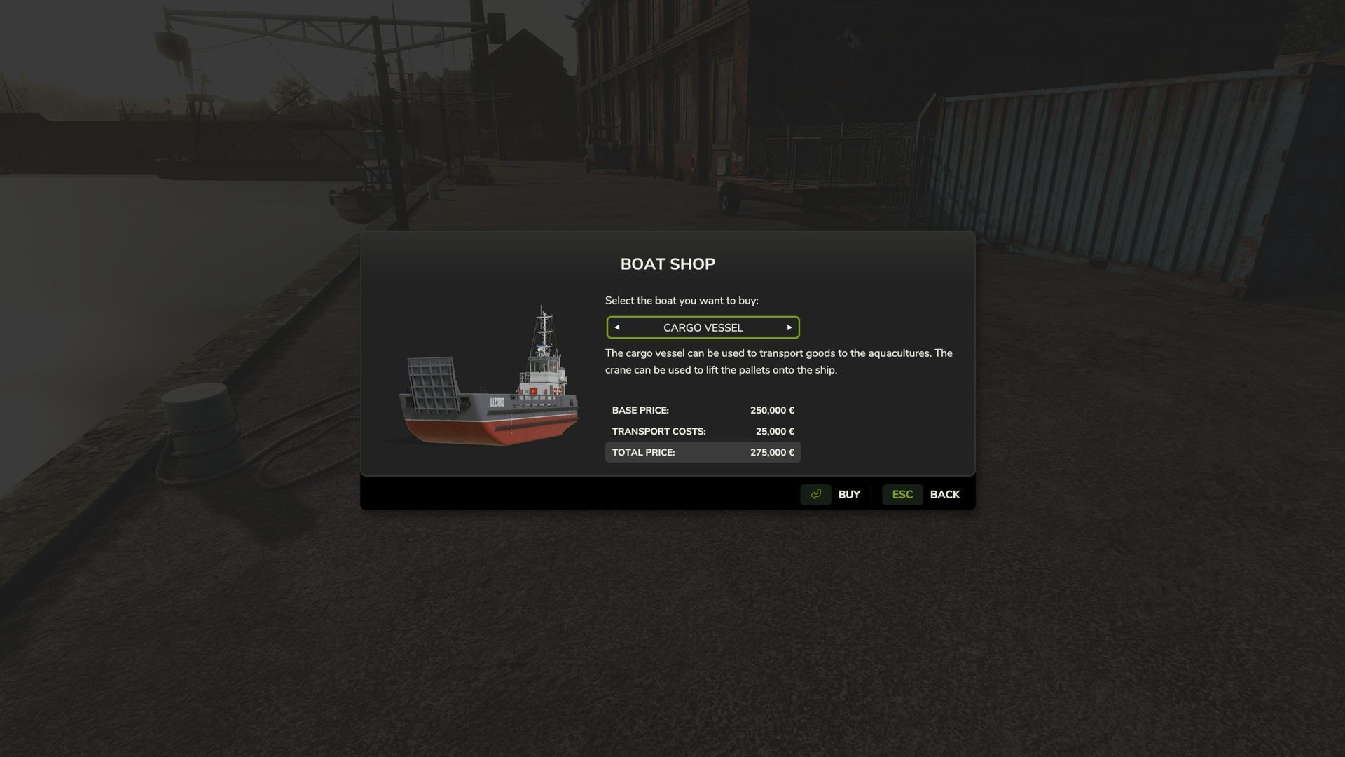 Żeby przetransportować młode łososie na morską farmę, musicie skorzystać ze Statku towarowego, dostępnego do kupienia w porcie za 275000 Euro. Statek posiada obniżaną platformę, dzięki której możecie wjechać na pokład ciągnikiem z przyczepą. Pomocna w tym manewrze rampa znajduje się w południowej części portu.