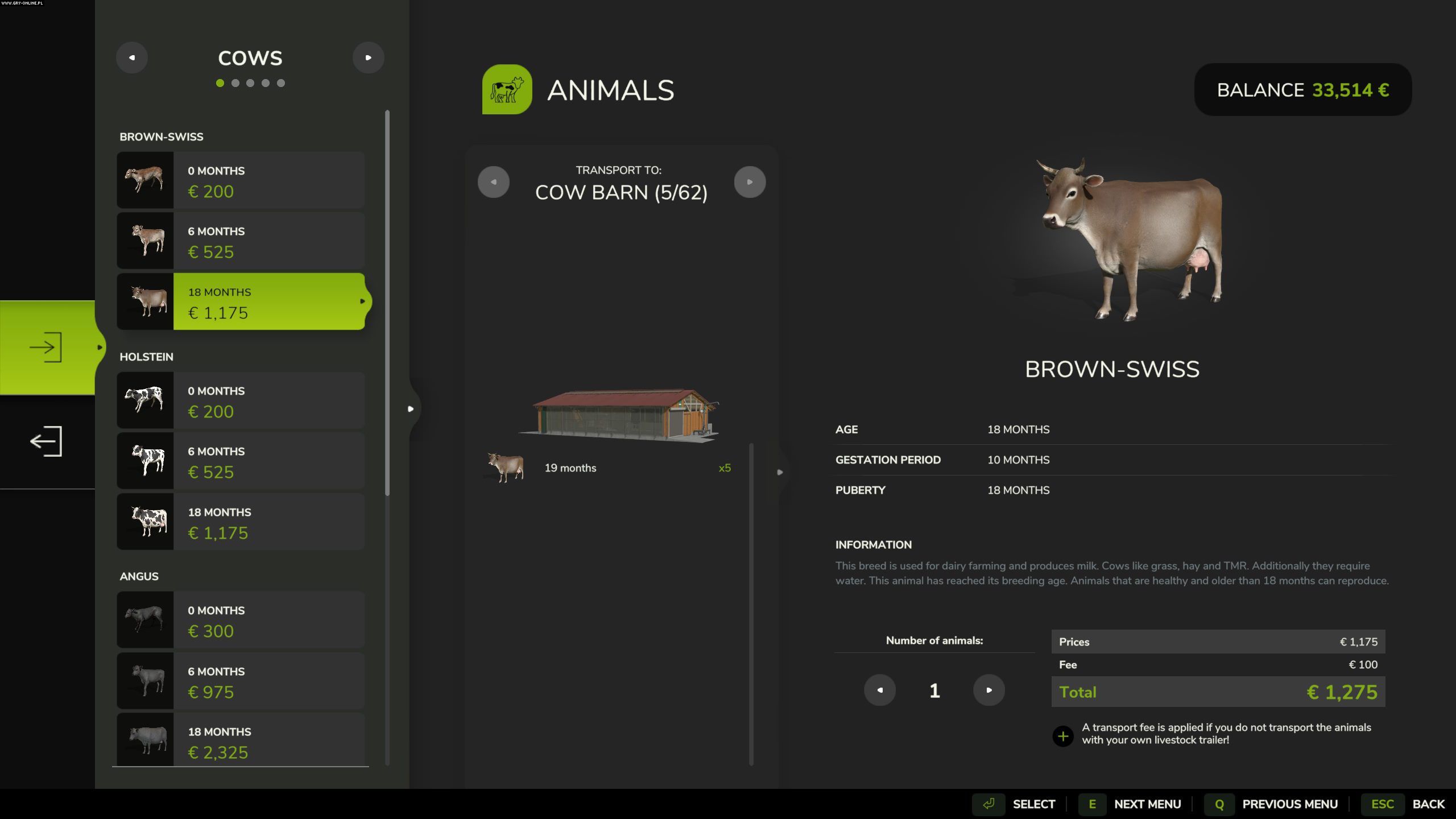 Dostępne są 4 gatunki krów: Brown-Swiss, Holsztyno-Fryzyjska, Angus i Limousin. Dwie pierwsze przeznaczone są do wytwarzania mleka. Kolejne dwie natomiast przeznaczone są tylko na hodowlę i późniejszą sprzedaż. Przed zakupem musicie więc odpowiedzieć sobie na pytanie, na czym bardziej Wam zależy.
