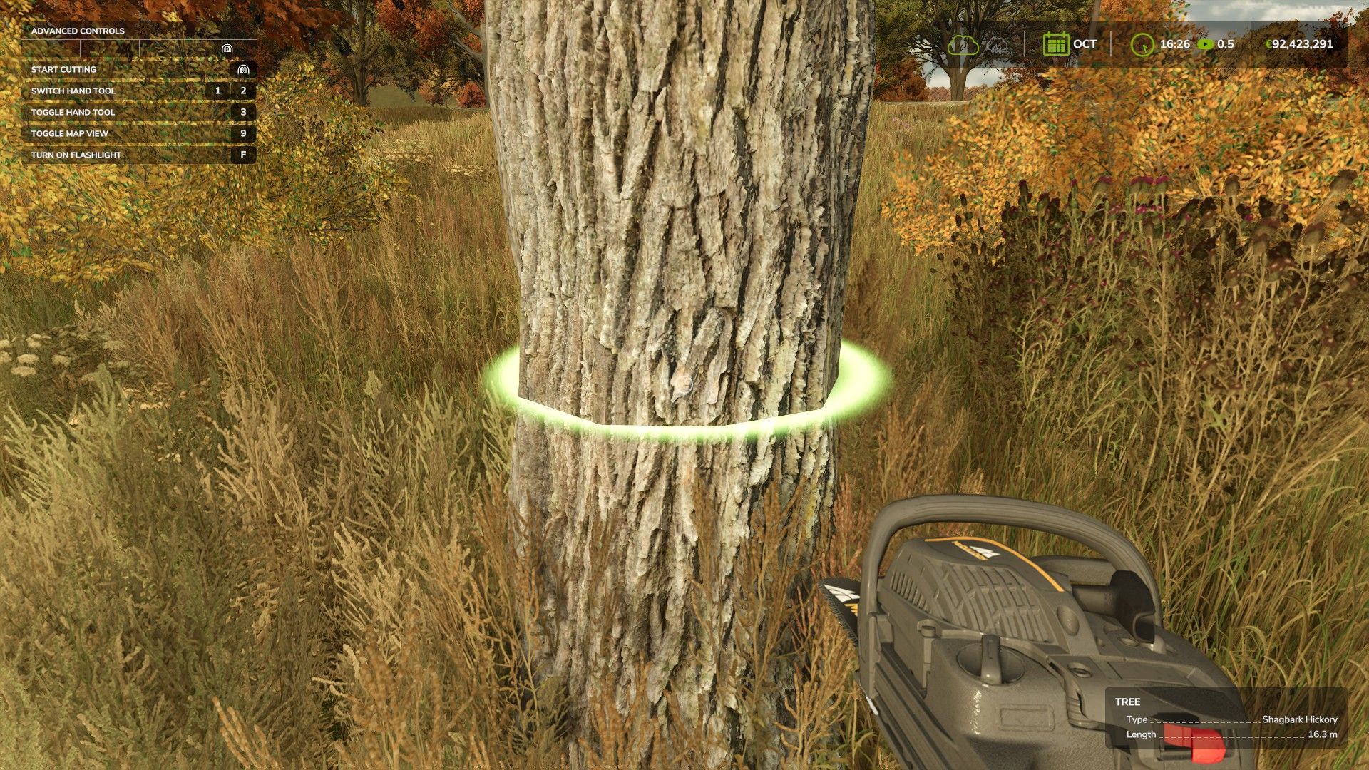 - Piła łańcuchowa lub kombajn do drzew - gdy drzewo urośnie, możecie je ściąć. W zależności od rodzaju drzewa możecie zrobić to piłą łańcuchową (po jej zakupie wyekwipujcie ją przyciskami 1 albo 2) lub kombajnem, podpinanym na przód ciągnika lub samobieżnym. Upewnijcie się, że ścinacie drzewo nisko. Po obaleniu drzewa piłą (kąt cięcia możecie ustawić myszką) będziecie musieli poobcinać również gałęzie. Kombajny samobieżne są drogie, lecz dają wam dużo kontroli nad ramieniem wyposażonym w piły, dzięki czemu możecie bardzo łatwo ściąć drzewo, pozbyć się gałęzi i pociąć je na mniejsze kłody.