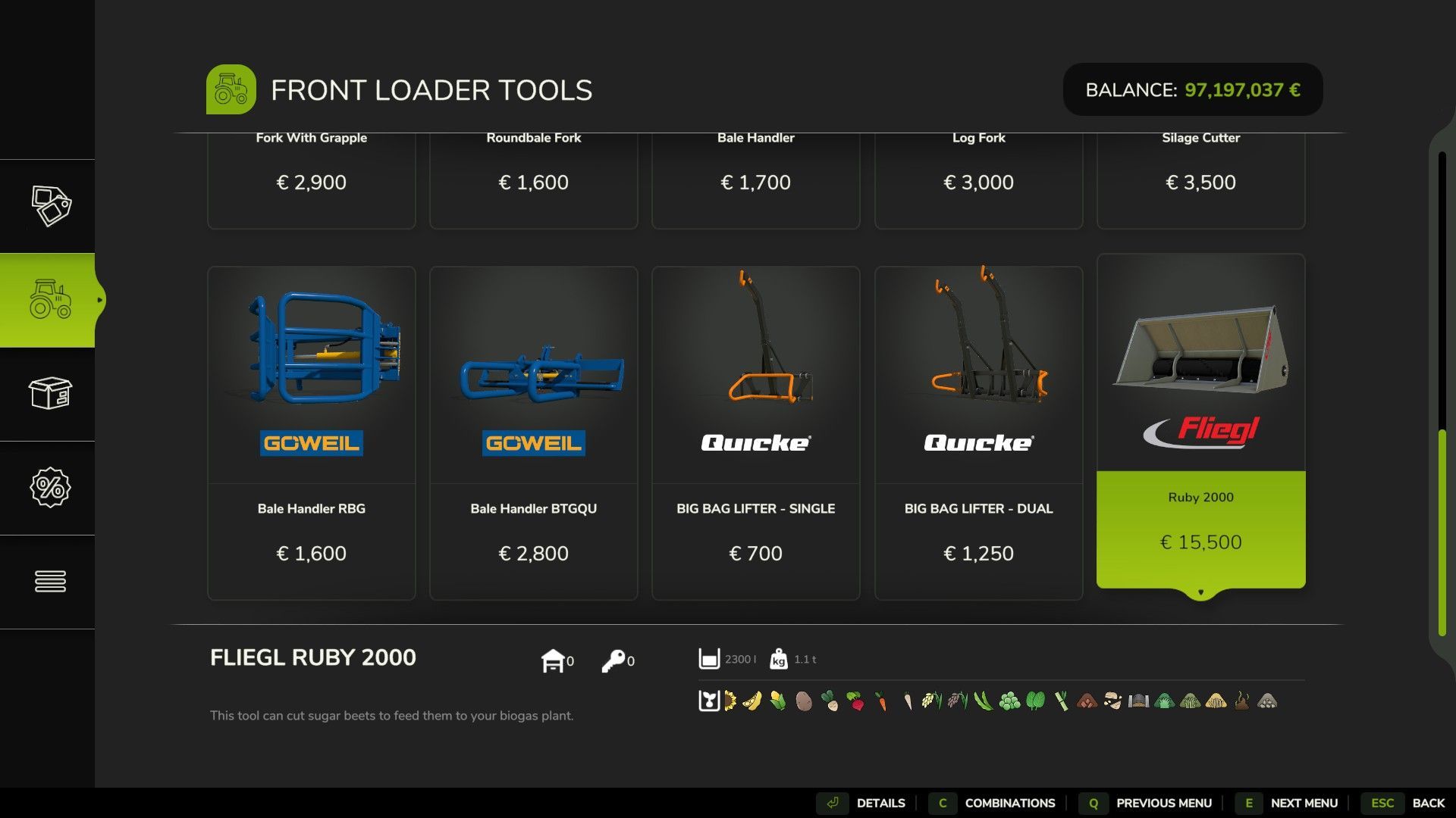 - Ładowacz czołowy z nasadką Ruby 2000 (opcjonalne) - zebrane buraki cukrowe przełożyć możecie do ładowacza czołowego wyekwipowanego w specjalną nasadkę Ruby 2000. Aktywowanie nasadki potnie znajdujące się w niej buraki, przerabiając je na ścinki buraczane. Są one warte więcej od całych buraków i mają więcej zastosowań.
