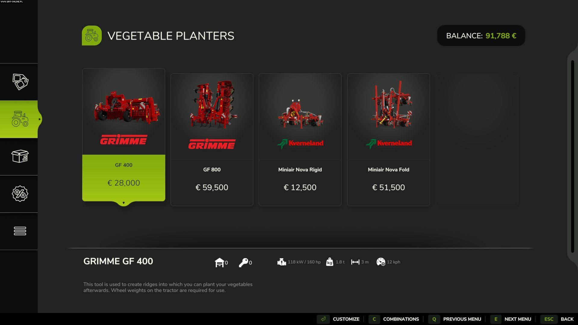 - Będąc już na polu, wybierzcie odpowiednią roślinę (przycisk Y), a następnie włączcie i obniżcie maszynę. Jeżeli gracie z włączonym kalendarzem sezonowym pamiętajcie, by siać jedynie rośliny będące aktualnie w sezonie.