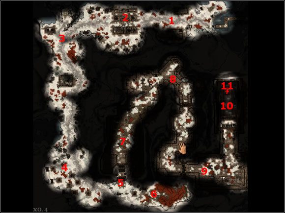 Od samego początku musimy się kierować na południe (1) . Pomimo że opór wroga jest rozłożony stosunkowo równomiernie, nie jest łatwo przedzierać się przez kolejne legiony potworów. Wkrótce dojdziemy do bardzo ciekawego miejsca, warto się mu bliżej przyjrzeć (2) . W punkcie oznaczonym numerkiem (3) zmienimy kierunek podróżowania na południowy. Zwróćcie uwagę na to, że poruszamy się po ogromnych terenach, co jak dotąd było niespotykane we Fraterze (może za wyjątkiem Dżungli). Przejdziemy przez sieć dziwnych maszynerii (4) , by po chwili znaleźć się przed wyraźnie wznoszącymi się poza otaczający teren schodami (5) . Możemy również odwiedzić cmentarzysko położone nieco dalej (6) . Jednak naszym priorytetem jest udanie się do monumentalnej stalowej fortecy (7) . Liczba wrogów jest, delikatnie mówiąc, przeogromna. Przywołujmy możliwie często demony, a jakoś przebijemy się przez hordy maruderów. Za jakiś czas naszą wędrówkę krótkotrwale wstrzymają trzy ruchome bariery śmierci (8) . Ich ominięcie to niezbyt trudne zadanie, jednakże cierpliwość jest tu bardzo wskazana. Nieopodal spotkamy duszka (9) , który opowie o mechanicznych pomocnikach stworzonych przez hrabiego Władimira. Problem tkwi w tym, że po śmierci stracił nad nimi panowanie, co niedługo obróci się przeciwko nam.