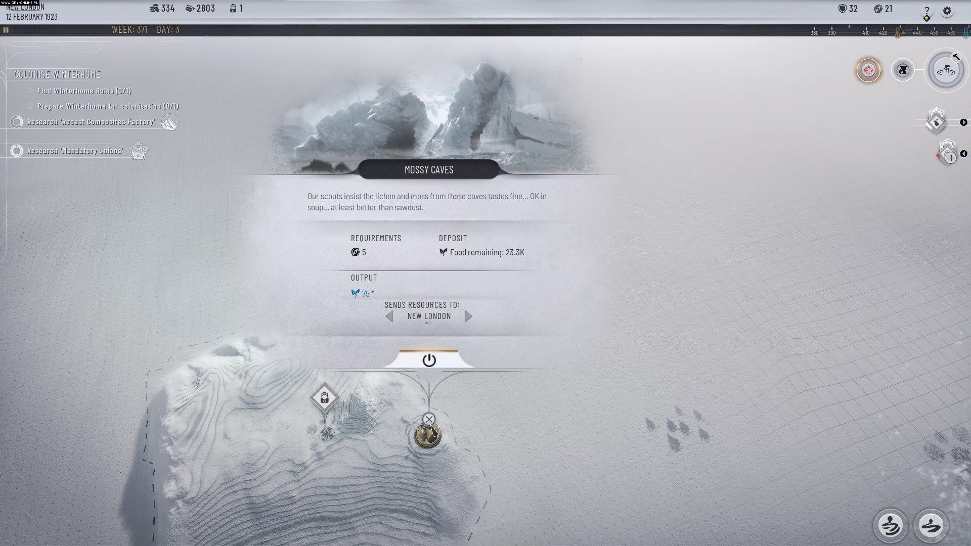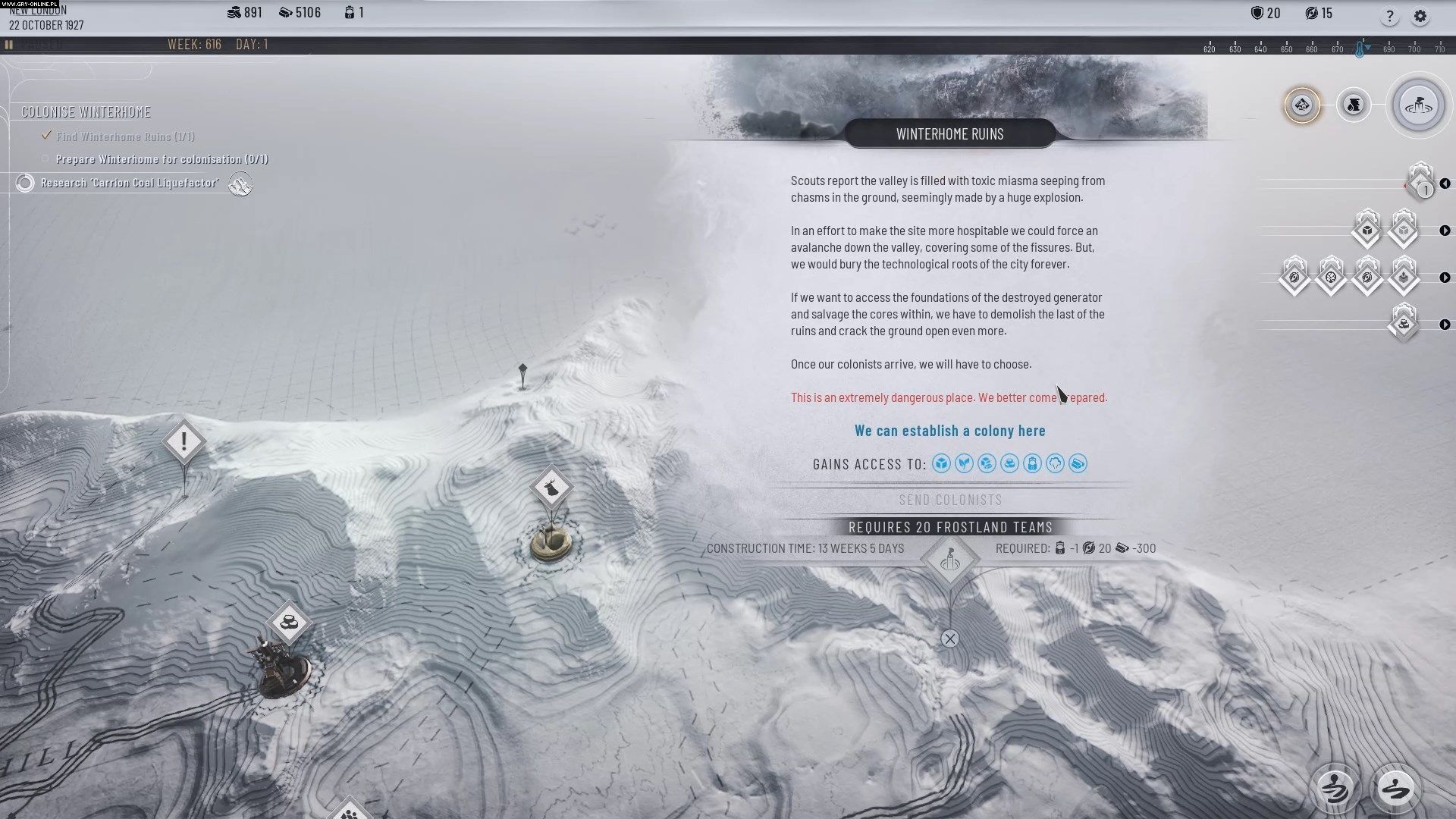 - Ponownie zacznijcie zajmować się eksploracją frostlandów. Odnajdowanie miejsc na posterunki pozwoli wam zaspokoić najbardziej naglące potrzeby miasta. Jeśli danego zasobu macie w bród, możecie nie zakładać jeszcze posterunku dostarczającego go, zatrzymując złoże na czarną godzinę.