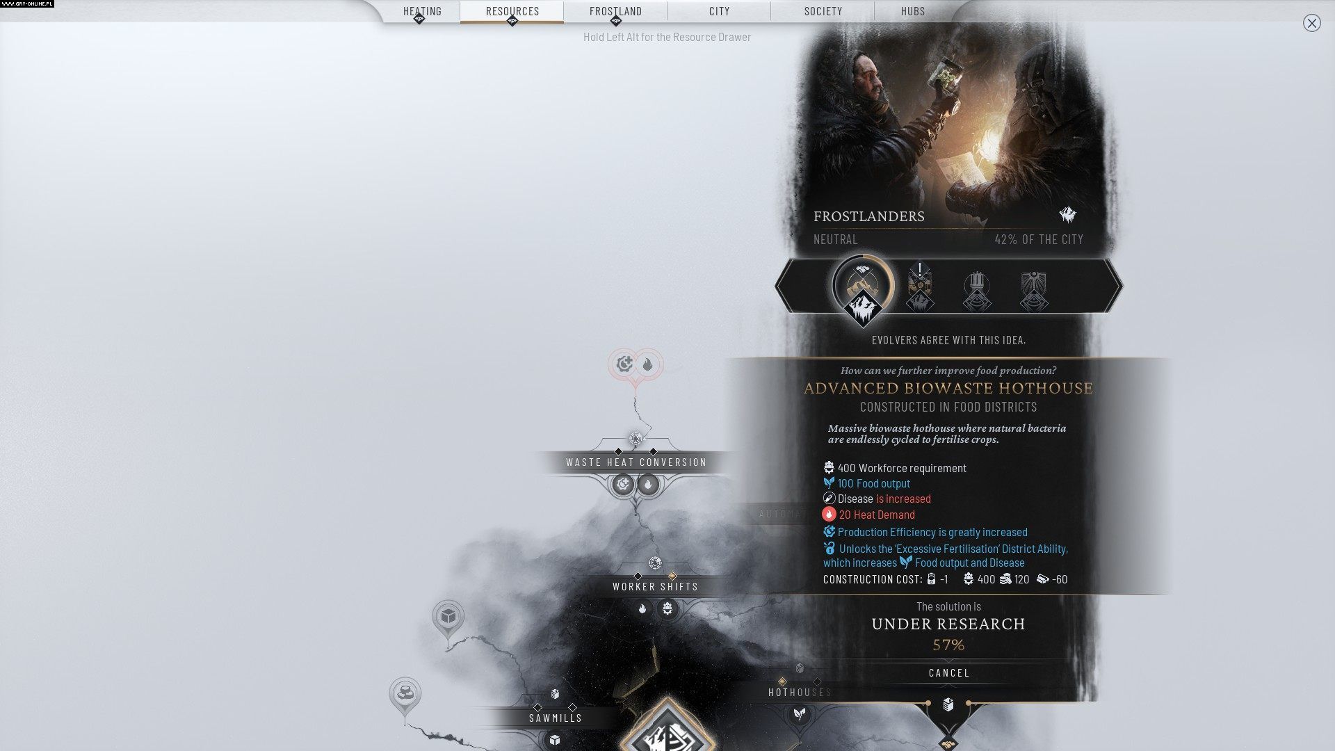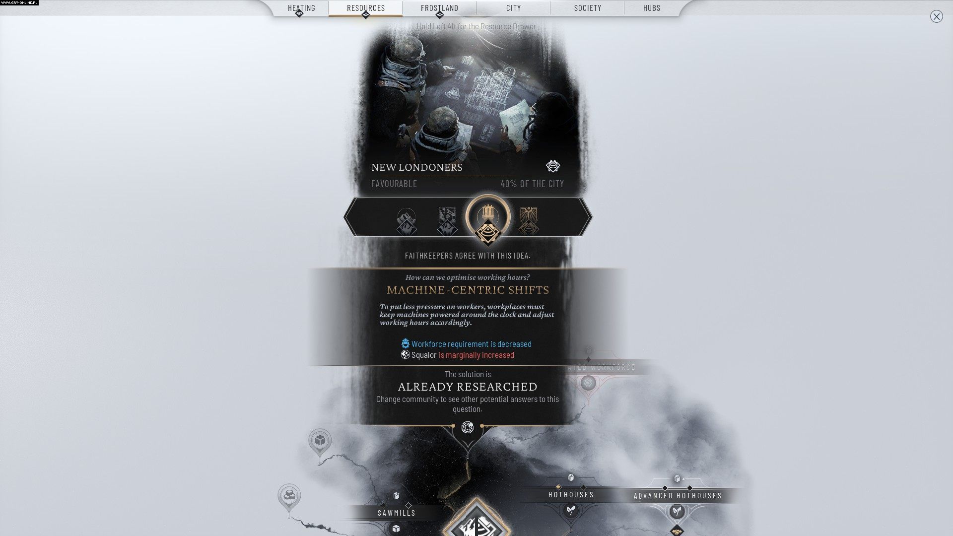 Dodatkowym sposobem na poradzenie sobie z niedoborami jedzenia mogą być Cieplarnie, które zbadacie w zakładce "Zasoby" na Drzewie idei. Te specjalne budynki mogą zostać umieszczone bezpośrednio w dzielnicach spożywczych, co umożliwi Wam produkowanie znacznie większych ilości jedzenia na tym samym obszarze. Decyzję pomiędzy wariantem cieplarnianym oraz chemicznym musicie podjąć sami w oparciu o potencjalne efekty uboczne oraz preferowany przez Was kierunek rozwoju miasta.