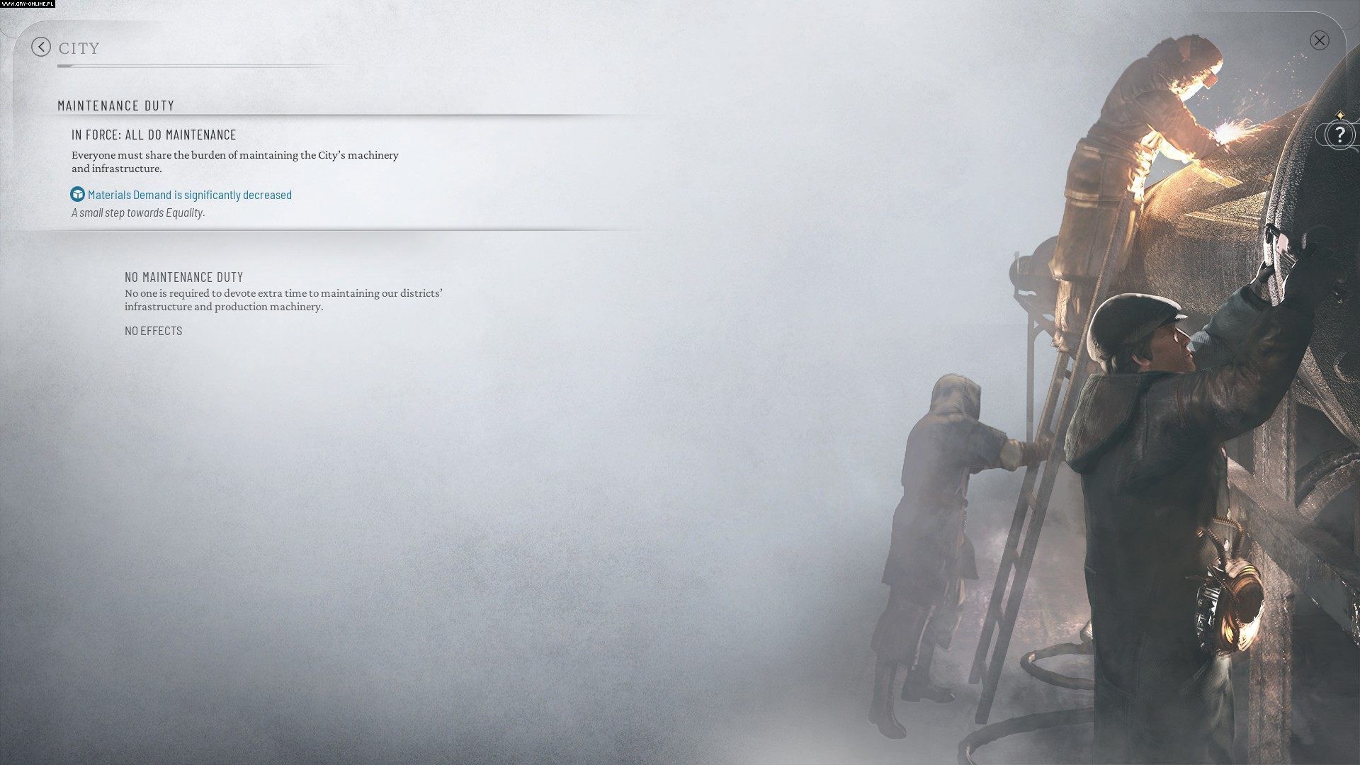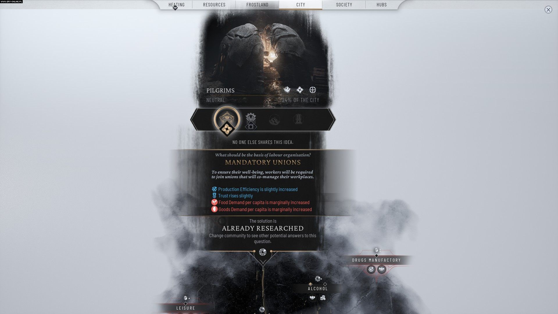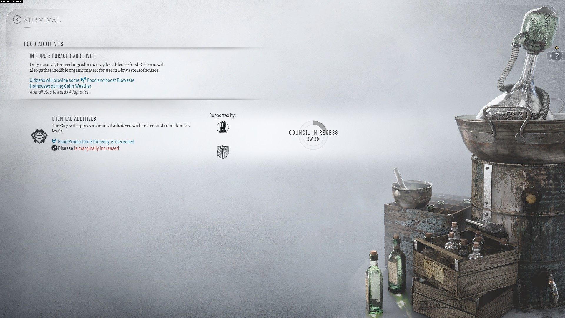 Dużym problemem dla rozwijającego się miasta może być wstępne ustabilizowanie produkcji żywności. By sobie w tym pomóc, na wczesnym etapie gry zaproponujcie jedno z dwóch praw związanych z urozmaicaniem diety mieszkańców. W zasadzie obie opcje, chemiczna oraz naturalna, są dość dobre i powinny poskutkować szybką poprawą stanu Waszych spiżarni. Podejmując decyzję sugerujcie się zatem kierunkiem rozwoju, ku której chcecie się zwracać.