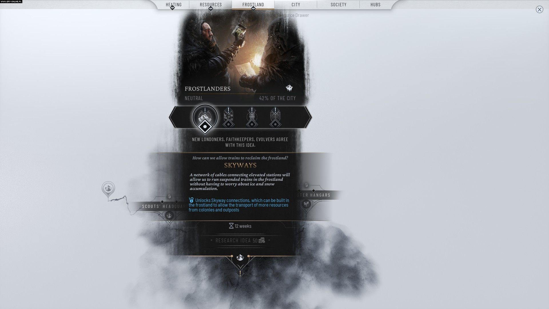 Jeżeli na liście Waszych priorytetów znajduje się eksploracja, to zdecydowanie zainwestujcie w te dwie idee z zakładki "Frostland". Obydwie technologie znacząco ułatwiają transportowanie dóbr przez zamarznięte pustkowia, co umożliwia łatwiejsze zdecentralizowanie produkcji oraz wydobycia.