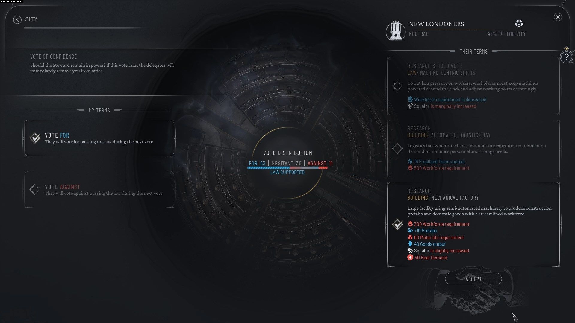 Musicie negocjować z jedną z dwóch większych frakcji - w zamian za pozytywny głos obiecajcie im wcielić w życie lub zbadać jedno z trzech wybranych przez nie praw i technologii. Ta obietnica powinna wystarczyć, by zwyciężyć w głosowaniu - wybierzcie obietnicę, która według was się wam przyda. Od tego czasu zwołujcie zebrania rady kiedy tylko jest taka możliwość by tworzyć nowe prawa.