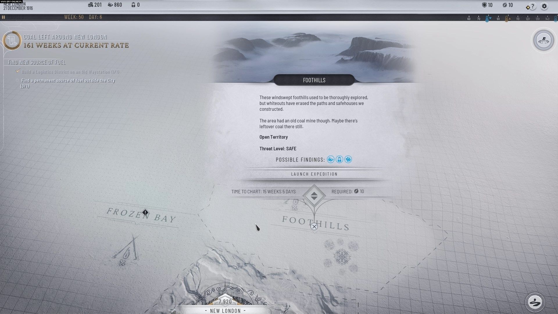 Możecie teraz zacząć wysyłać ekspedycje do innych regionów - waszym celem jest znalezienie ropy. Najpierw jednak wyślijcie swoich zwiadowców do dwóch pobliskich, bezpiecznych regionów - w naszym wypadku były to pagórki i zamarznięta zatoka. W obu znaleźliśmy miejsca na posterunki, które zapewniły nam duże ilości węgla i jedzenia, a także nowych osadników.
