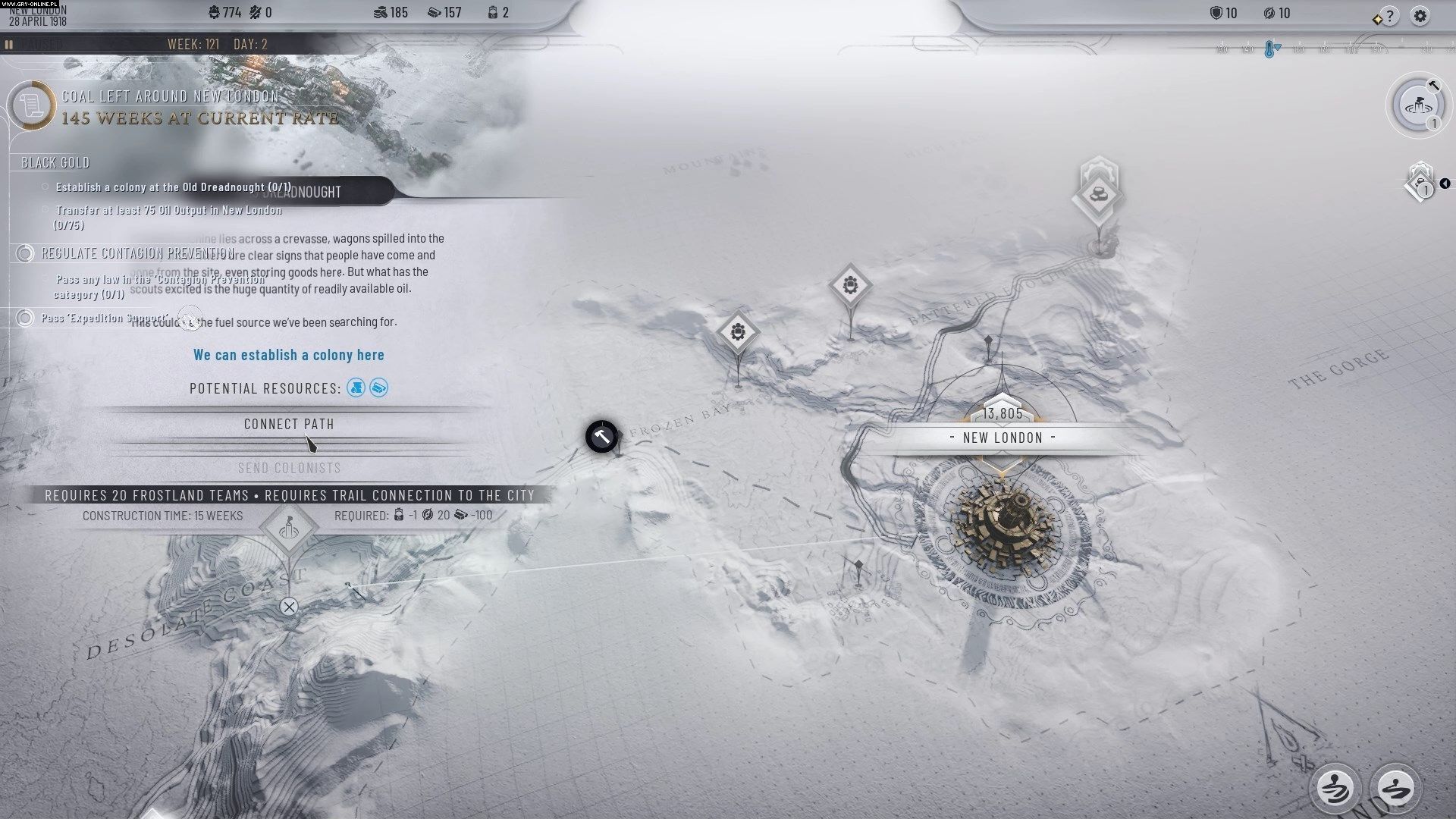 Następnie zbadajcie bezpieczny region sąsiadujący z zamarzniętą zatoką (jeśli zabraknie wam zwiadowców, zbudujcie drugą dzielnicę logistyczną lub zbadajcie budynek ulepszający takowe). Znajdziecie tam stary drednot - miejsce na założenie kolonii, skąd możecie wydobywać ropę. Połączcie Nowy Londyn i stary drednot drogą lub koleją linową, po czym wyślijcie kolonistów by osiedlili się tam.