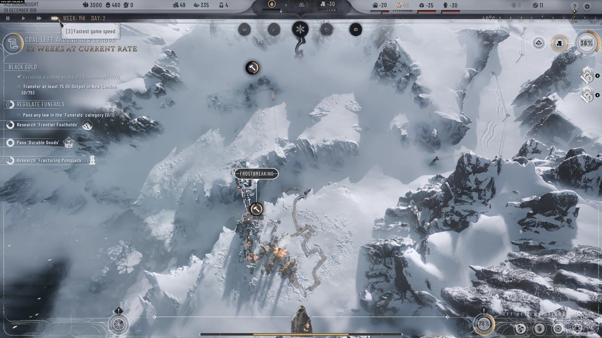 - Po założeniu nowej kolonii jak najszybciej przełamcie lód do dostępnych zasobów i wyeksploatujcie je - każdą kolonią musicie zajmować się manualnie. Przejęcie dwóch złóż ropy powinno pozwolić wam zacząć wysyłać wystarczającą ilość paliwa do Nowego Londynu i tym samym zakończyć rozdział.