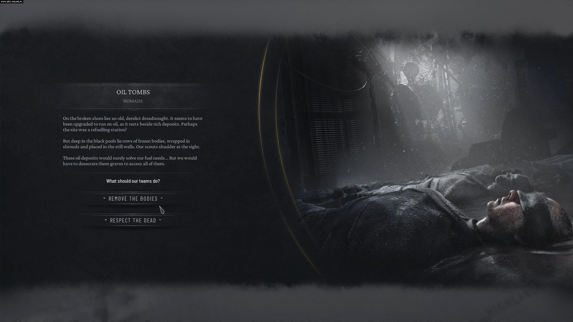 W pierwszym rozdziale gry po założeniu kolonii w starym drednocie znajdziecie poszukiwane złoża ropy. W jednym z nich znajdują się jednak pochowane zwłoki nomadów, którzy niegdyś zamieszkiwali to miejsce. Musicie więc zdecydować co zrobić z tym konkretnym złożem. Dostępne wybory to: