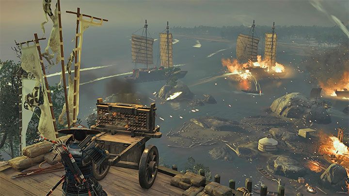 W pierwszej części tej sceny szukaj okazji do bombardowania małych statków Mongołów oraz przeciwników stojących na brzegu. W przypadku ruchomych celów bierz niewielką poprawkę przy celowaniu, bo minie chwila zanim strzały docelą do celu.