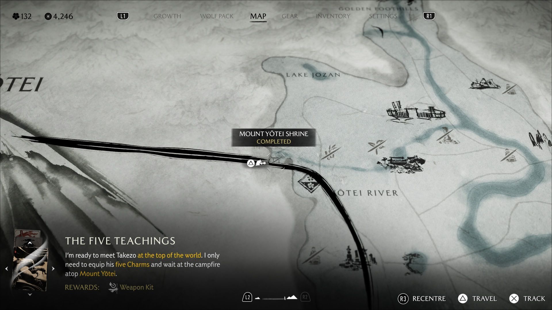 - zaczep - interakcja z nim pozwala szybko zejść z góry i powrócić do regionu Łąki Yotei.