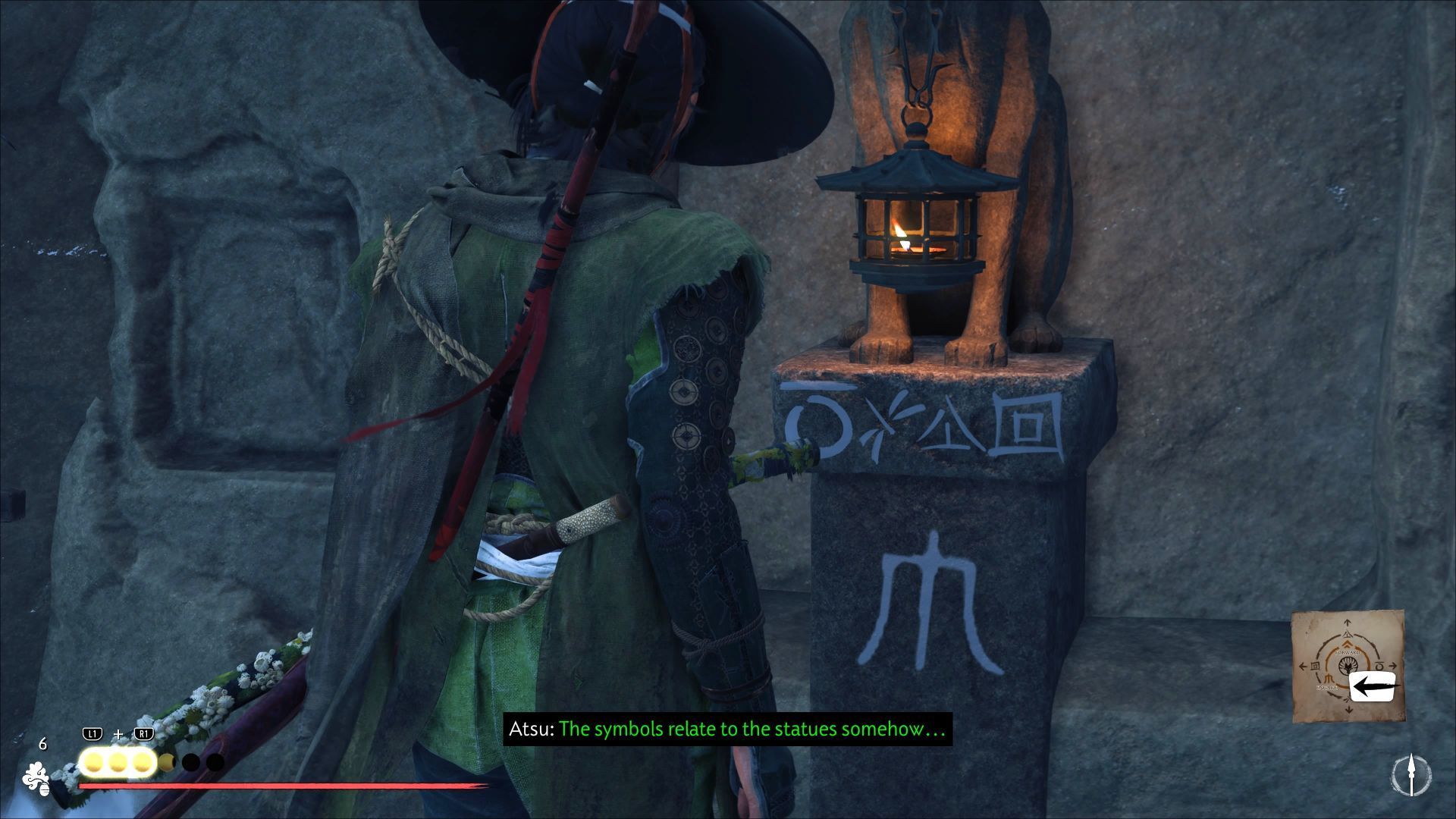 - Dla przypomnienia szyfr służy do rozwiązywania łamigłówek z symbolami oraz posągami lisów i w całym północnym regionie jest ponad 20 różnych do zaliczenia. Irytować może to, że Atsu może komentować zagadkę po źle wykonanym ruchu, np. po ustawieniu posągów w złych pozycjach czy zapaleniu złych lampionów. Podpowiedzi bohaterki nie prezentują gotowego rozwiązania, ale mimo wszystko mogą burzyć przyjemność z samodzielnego dojścia do właściwych wniosków.