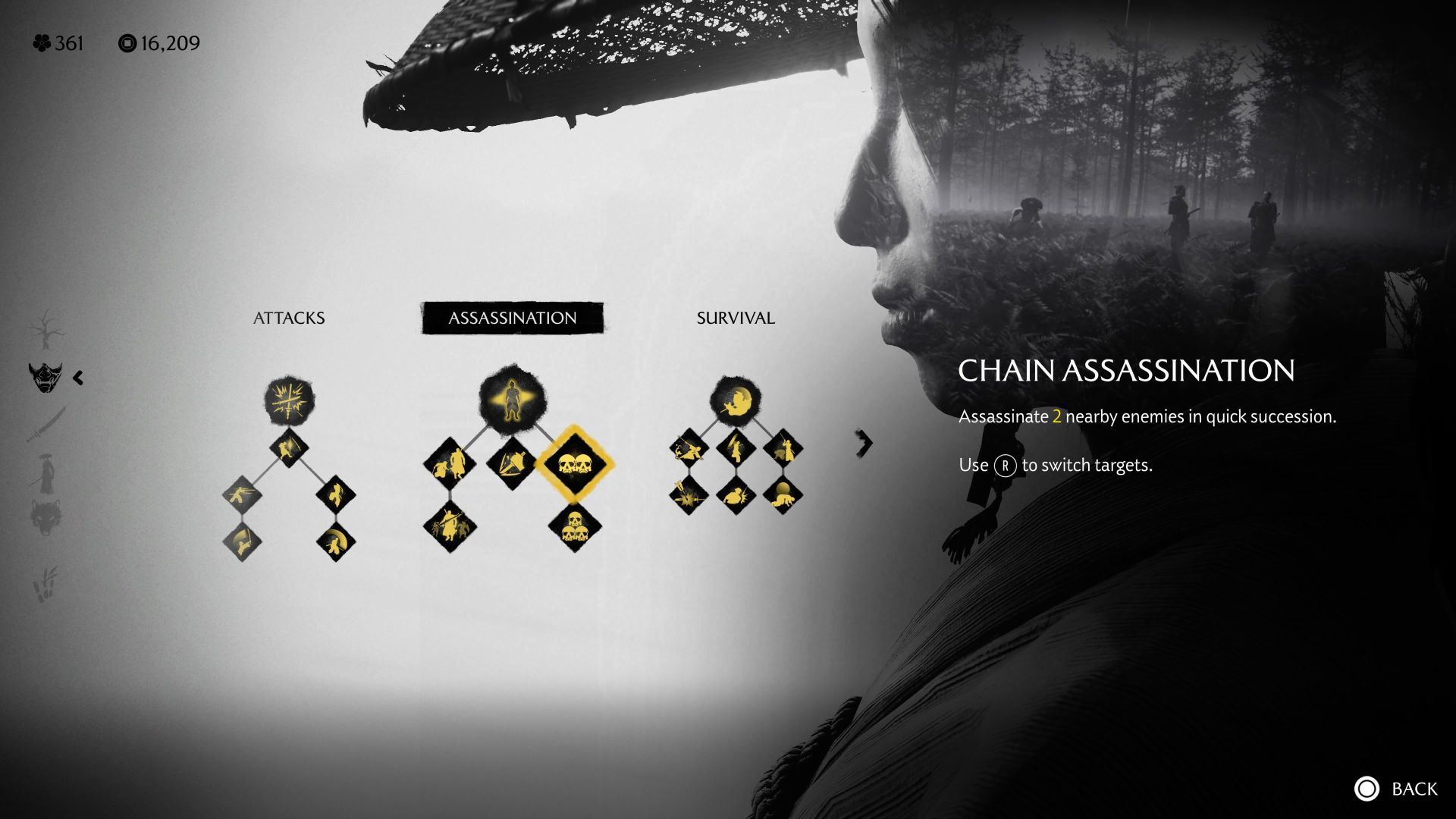 Dostępne są 2 umiejętności i docelowo Atsu może wykonać do 3 ataków skrytobójczych w serii. Po każdej egzekucji (Trójkąt) możecie użyć prawej gałki analogowej do zwrócenia się w stronę kolejnego celu.