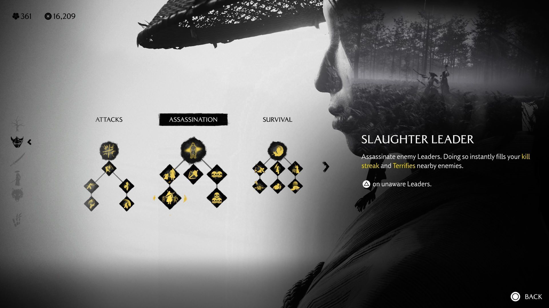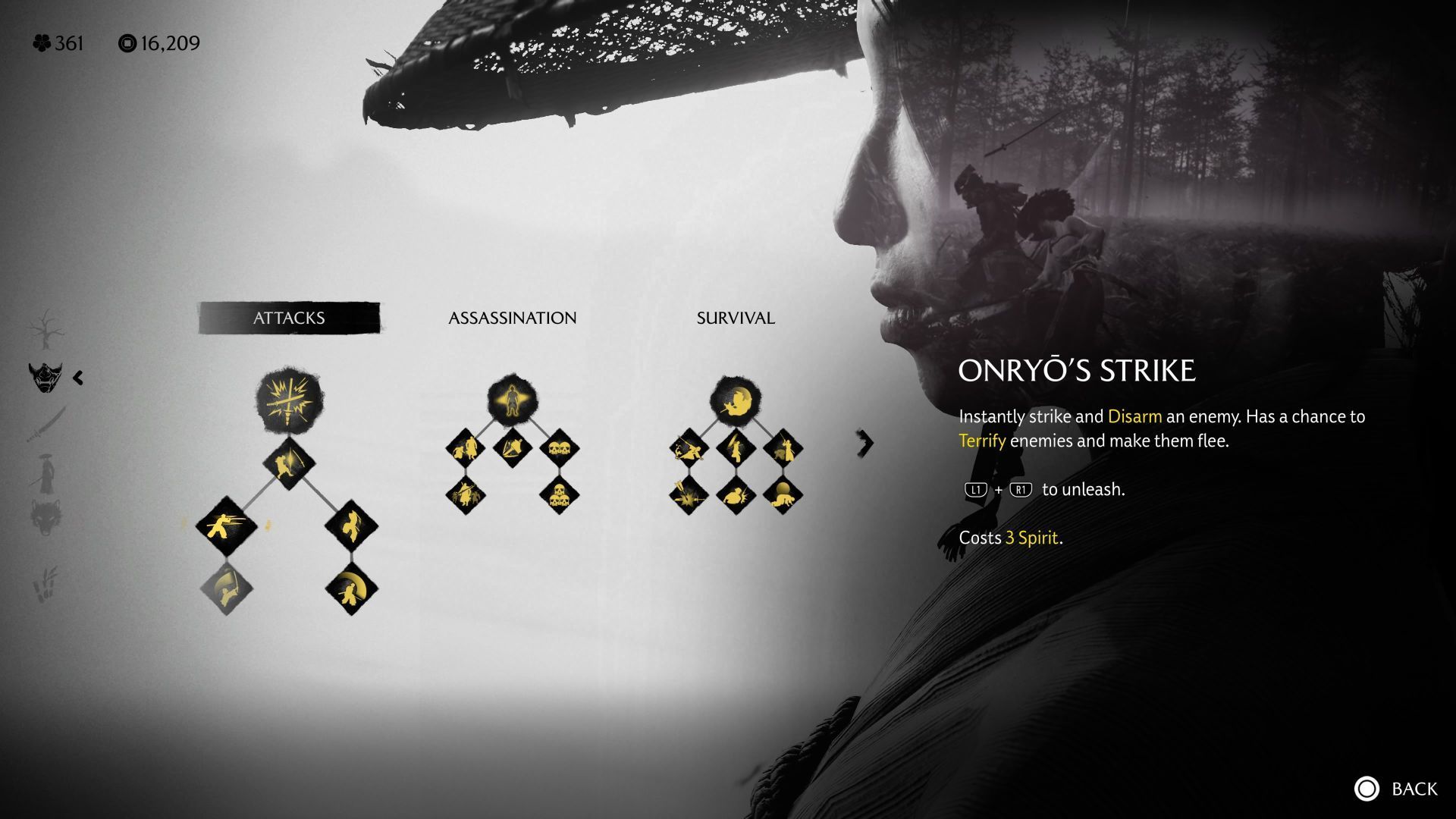 Po wykonaniu 4 (Wycie Onryo) lub 6 zabójstw (Postawa ducha) możecie wcisnąć L3+R3. Polecamy dłużej czekać z serią zabójstw i starać się o aktywację drugiej z wymienionych umiejętności. Postawa ducha pozwoli Wam zabić kilku okolicznych wrogów zabójczymi atakami. Nie mogą się oni wybronić przed tymi ciosami.