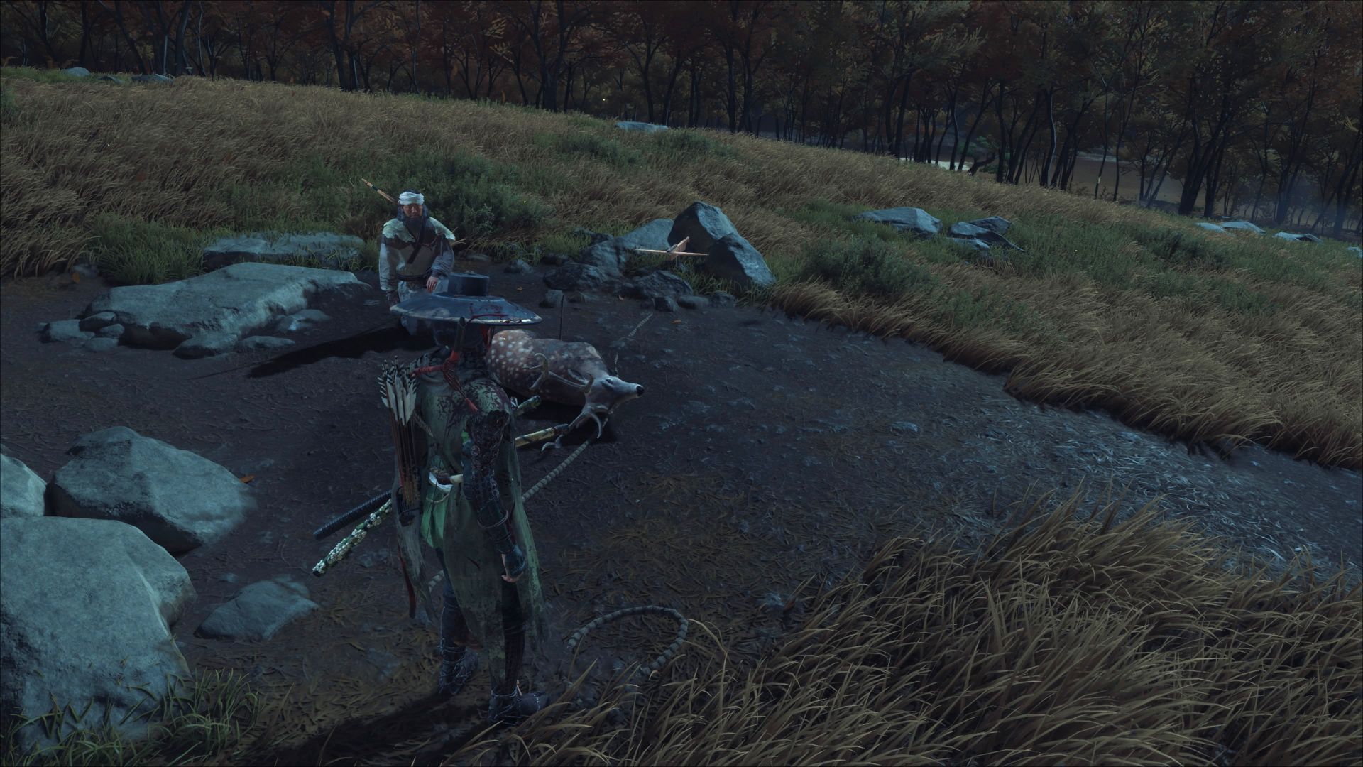 Przeszukajcie południową część regionu, na północ od lokacji Bambusowe wzgórza. Znajdziecie myśliwego i martwego jelenia. Porozmawiajcie z mężczyzną żeby odblokować znajdźkę.
