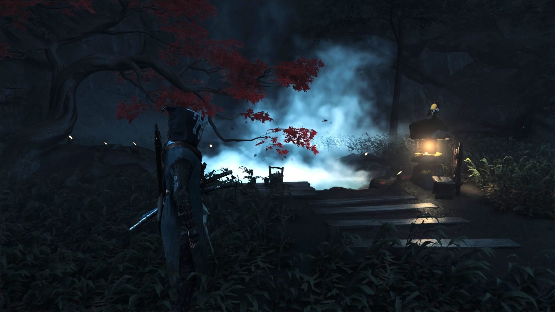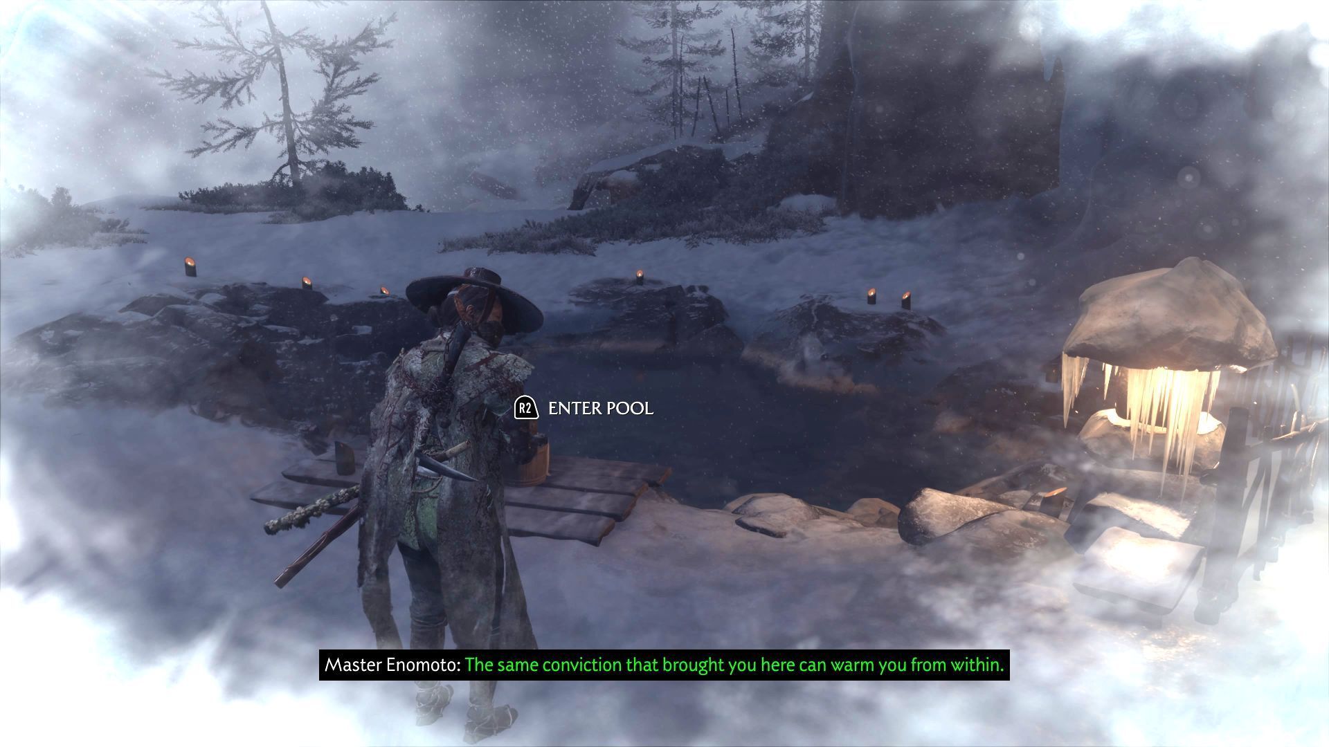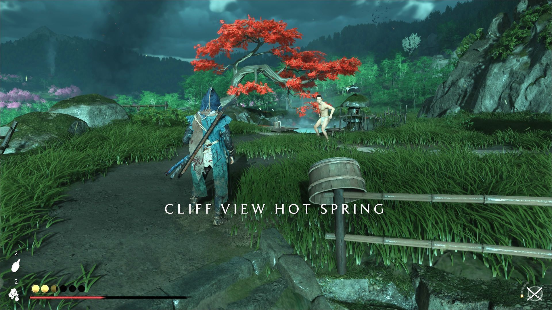 - Przy niektórych źródłach znajdziecie znajdźki (np. talizmany) lub fabularne notatki. Przed kąpielą Atsu może także wykonać krótki utwór na Shamisenie.
