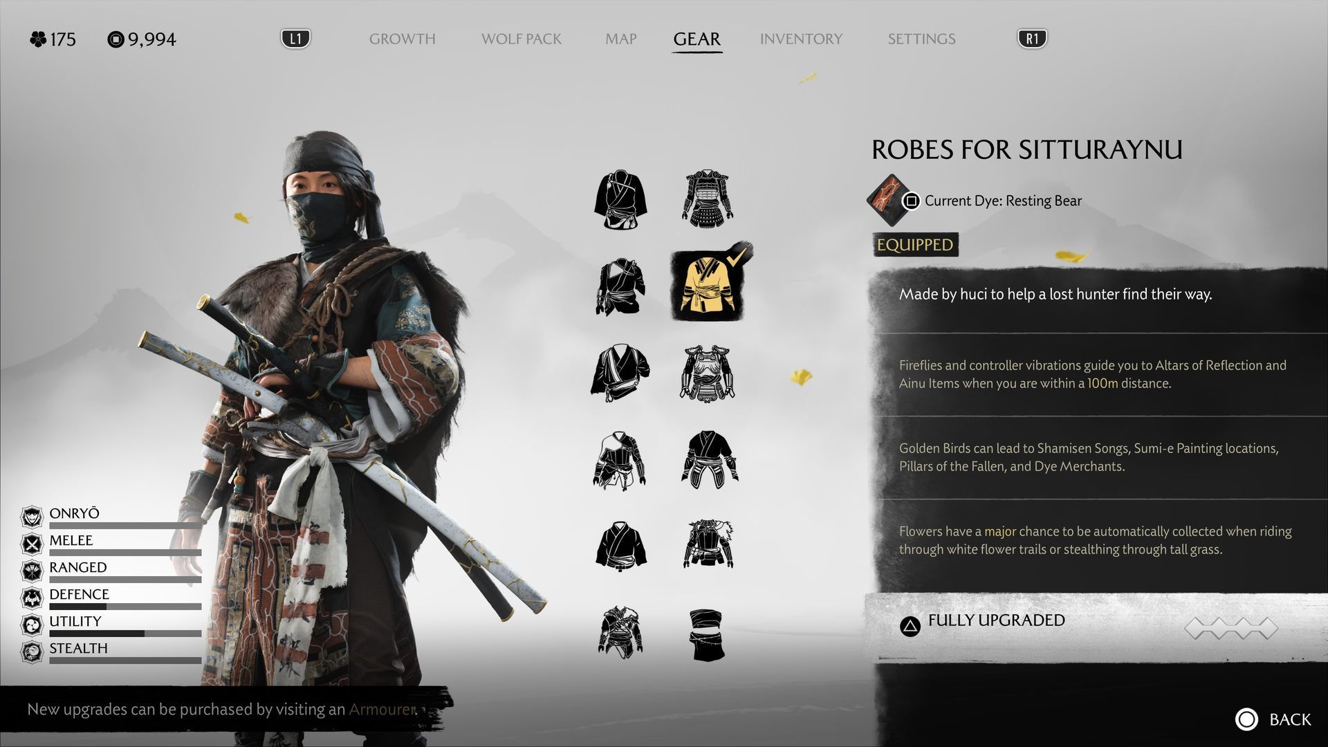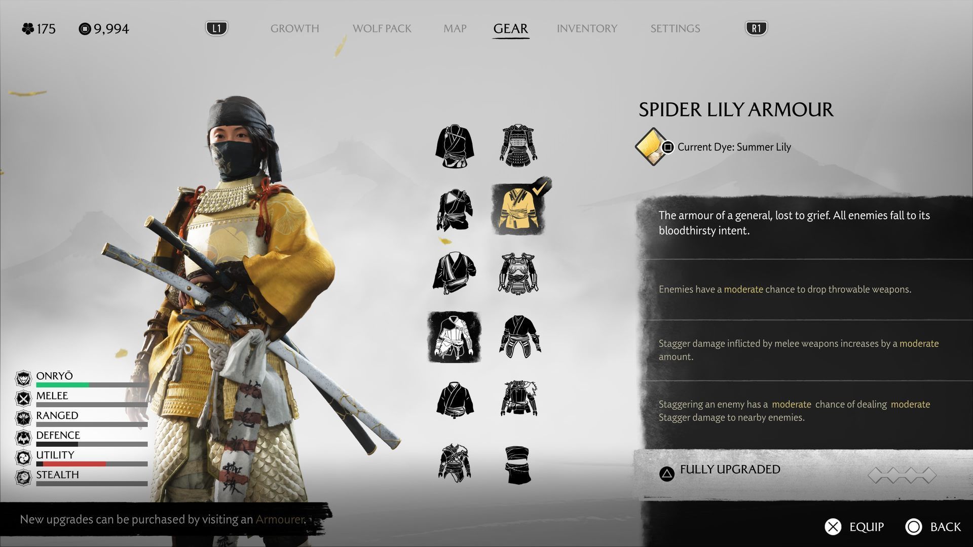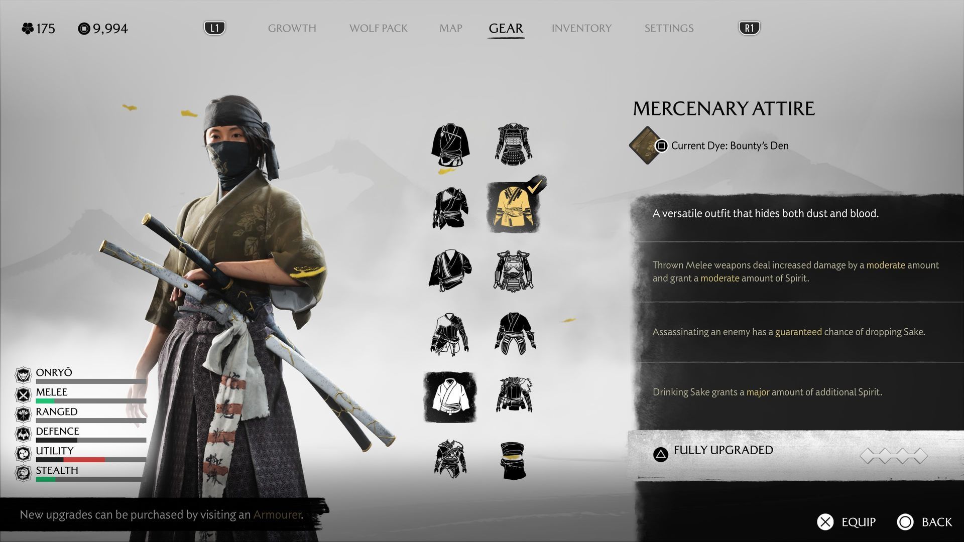 - Strój zwiększa obrażenia od rzucanej broni białej, a także zapewnia wzrost siły duchowej w czasie jej używania. Zabici z ukrycia wrogowie upuszczają również sake, które w dużym stopniu uzupełnia siłę duchową.