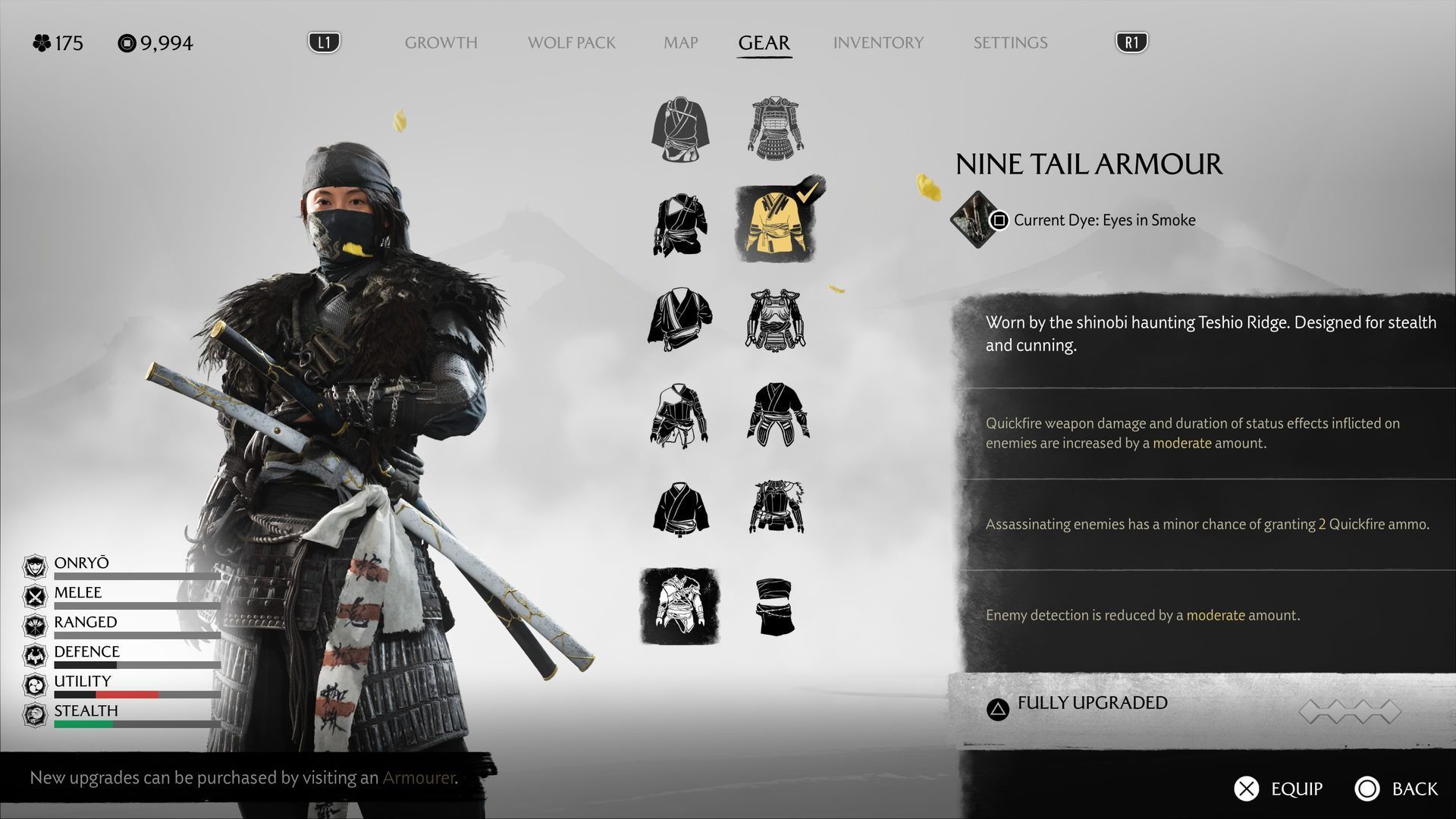 - Pancerz zmniejsza zdolność wykrywania Atsu przez wrogów, a także zwiększa obrażenia i efekty nakładane przez broń podręczną. Wreszcie, dokonywanie skrytobójstw ma niewielką szansę na zapewnienie 2 sztuk amunicji do broni podręcznej.