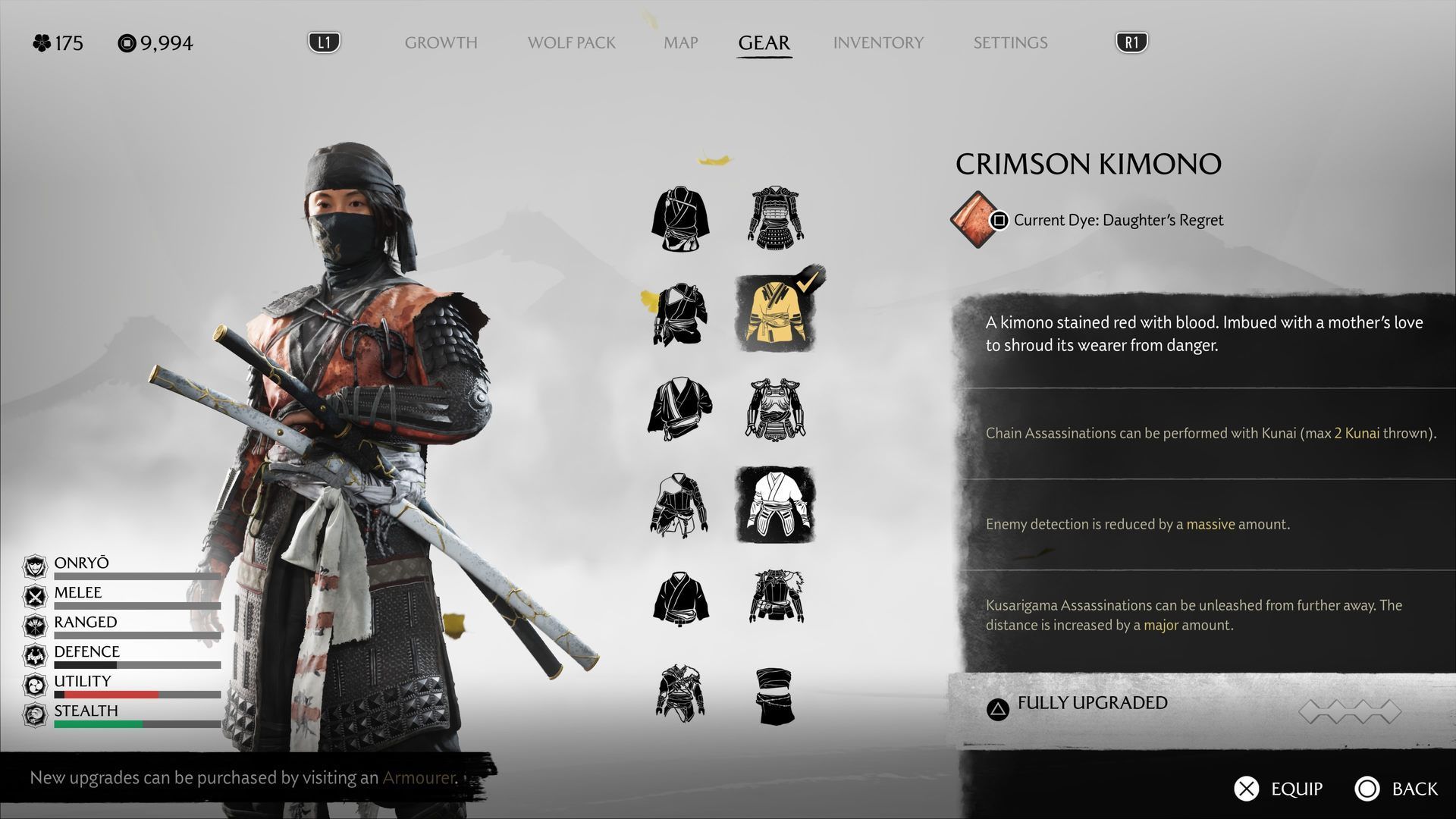 - Szkarłatne Kimono pozwala dokonywać serii zabójstw za pomocą kunai, a także znacznie ogranicza zdolność wykrywania Atsu przez wrogów. Pancerz wydłuża także odległość, z której możecie dokonywać skrytobójstwa przy użyciu kusarigamy.