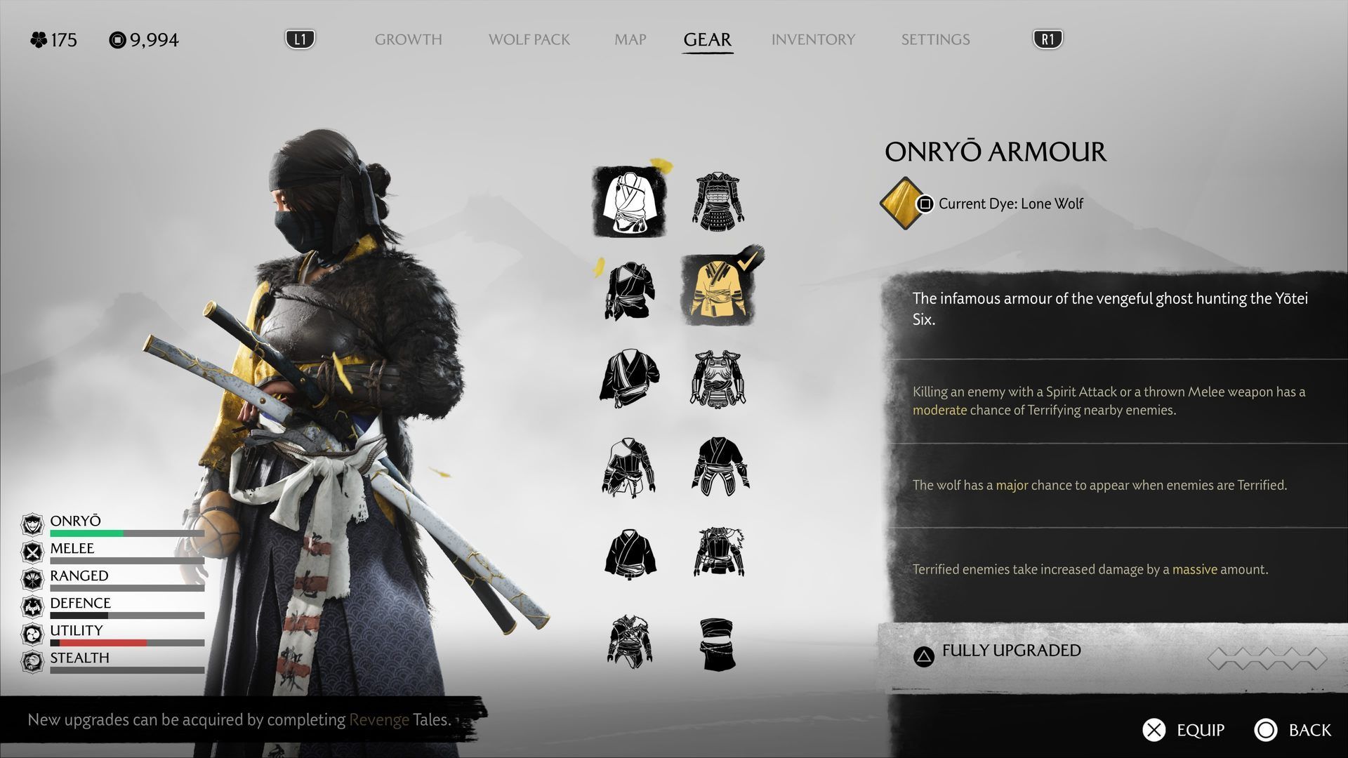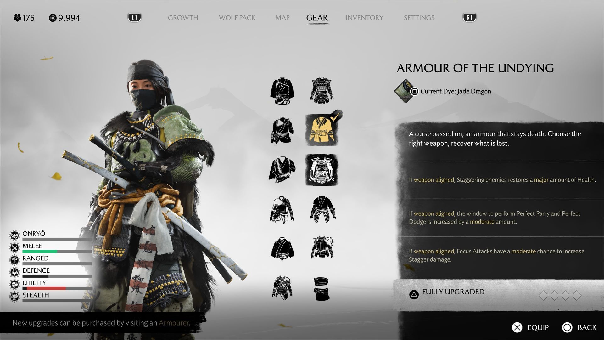 - Zbroja zwiększa szanse na oszołomienie przeciwników, wydłuża okienka parowania i uniku oraz umożliwia odzyskiwanie zdrowia podczas walki. Warunkiem dla tych bonusów jest jednak wykorzystywanie odpowiednio dobranej do przeciwnika broni (np. dwie katany na włócznie, odachi na dużych wrogów itd).