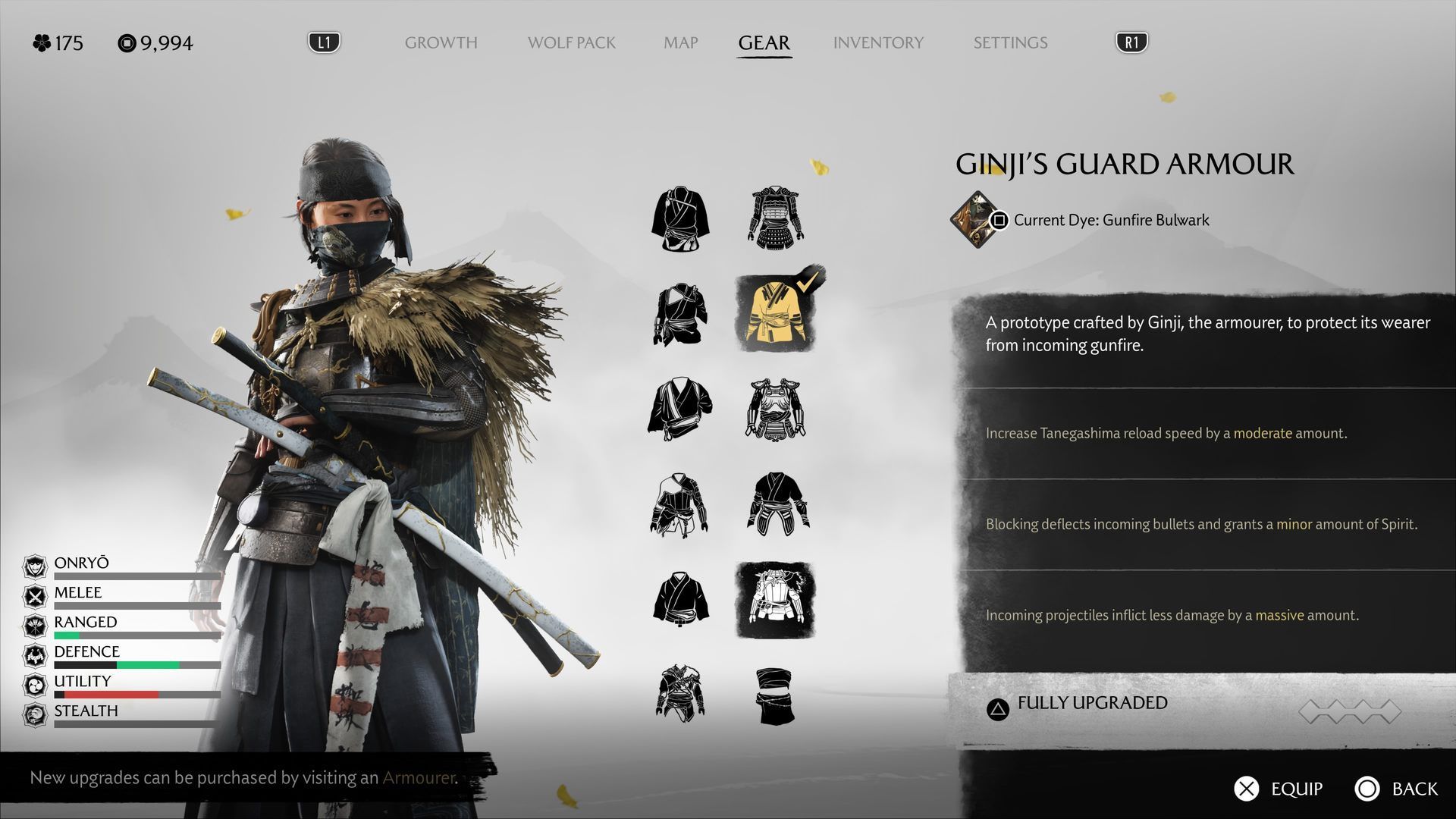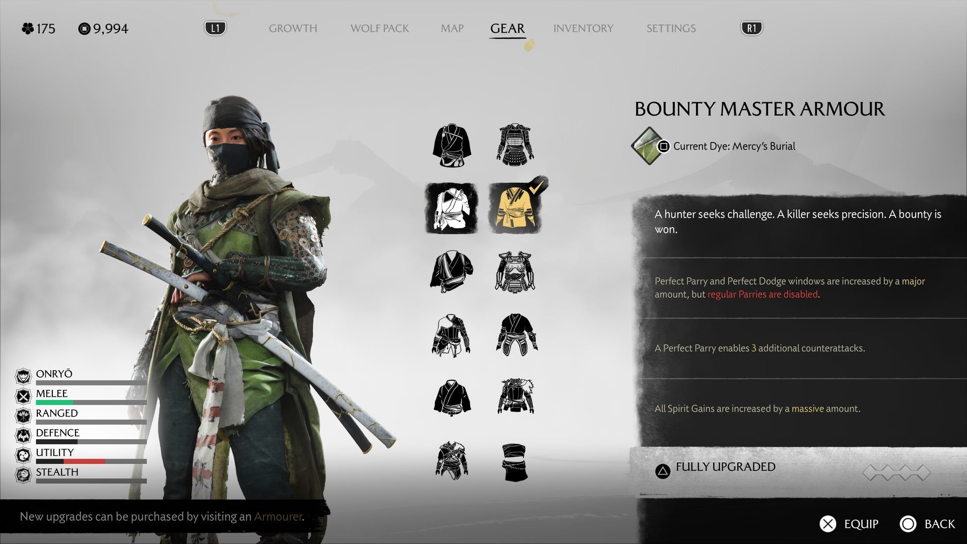 - Wydłuża czasowe okienko na perfekcyjne parowanie i unik, a także pozwala na natychmiastowe wykonanie serii kontrataków. Jednocześnie jednak blokuje "zwykłe" parowanie. Korzystanie z tej zbroi wymagać będzie zatem wyjątkowej precyzji i odpowiedniego dostosowania się do nowego stylu gry.