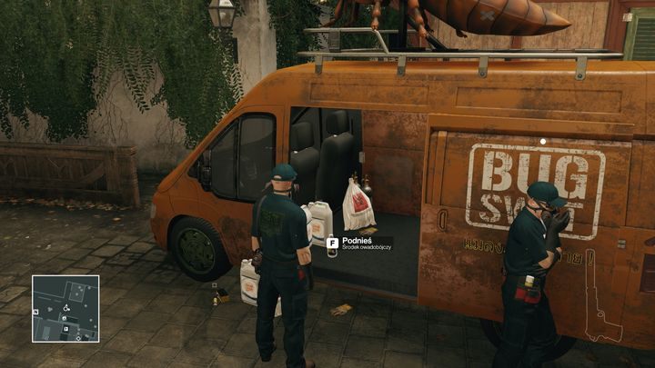 Teraz musisz zdobyć - o ile nie udało ci się tego zrobić wcześniej - środek owadobójczy (M6,7). W tym celu udaj się do pojazdu tępicieli robactwa. Dopiero po ubraniu stroju technika dezynsekcji zabranie chemikaliów nie będzie działaniem podejrzanym. Powinieneś jednak uważać, gdyż drugi technik bez trudu cię rozpozna - poczekaj, aż postanowi wejść do budynku lub zajmie się swoim telefonem.