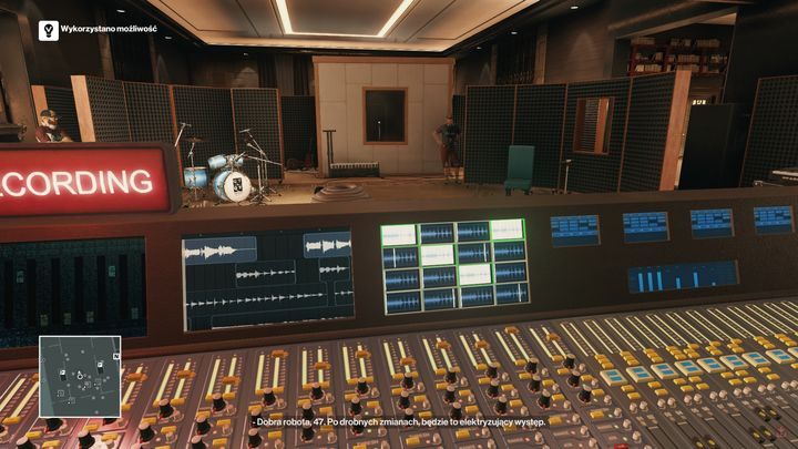 Producent każe agentowi 47 wymienić oryginalny mikrofon znajdujący się w kabinie na awaryjny Branson MD-2 (M6,8). Chwilę później odblokujesz osiągnięcie "47 zgłoś się". Uczyń to, o co poprosił protagonistę Wes, a następnie podejdź do miksera dźwięków (M6,26). Liston poprosi agenta 47 o zmiksowanie idealnego kawałka - minigierka polega na wybraniu właściwego wersu dźwiękowego w każdej z czterech kolumn.