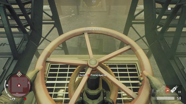 Niezależnie od podjętych działań będziesz musiał uważać na snajperów rozstawionych na wieżyczkach oraz rosomaków kręcących się po ulicy. Najlepiej jest wejść po prostu do środka i znaleźć odpowiednią osłonę. Sukcesywnie przemieszczaj się na schody, które zaprowadzą cię na pierwsze piętro. Znajdziesz tam zawór, który musisz odkręcić by zwiększyć ciśnienie w rurach. W ten sposób zniszczysz bazę KAL oraz stworzysz nowy przyczółek ruchu oporu. Za wykonane zadanie otrzymasz cztery punkty technologii KAL.