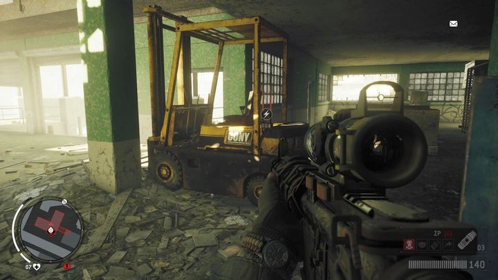 Po dotarciu na miejsce wejdź do środka budynku i przygotuj urządzenie hakujące. Rzuć go w stronę pokazanego na obrazku wózka widłowego i za jego pomocą dostań się na wyższe piętro.