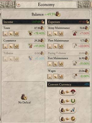 Na podatki, zyski z handlu oraz trybuty, możesz mieć wpływ poprzez zmianę polityk ekonomicznych dla zysków (Economic Policies for income). Dzięki temu możesz zwiększyć wpływy złota, kosztem innych dziedzin państwa np. przez wolniejszy rozwój technologii lub zwiększenie niepokojów w prowincjach. Jest to szczególnie przydatne w początkowych etapach gry, gdzie potrzebujesz dużej ilości pieniędzy. Jeśli zmniejszysz swoje dochody, otrzymasz bonus, który nadrobi straty finansowe np. mniejsze niepokoje społeczne w całym państwie.