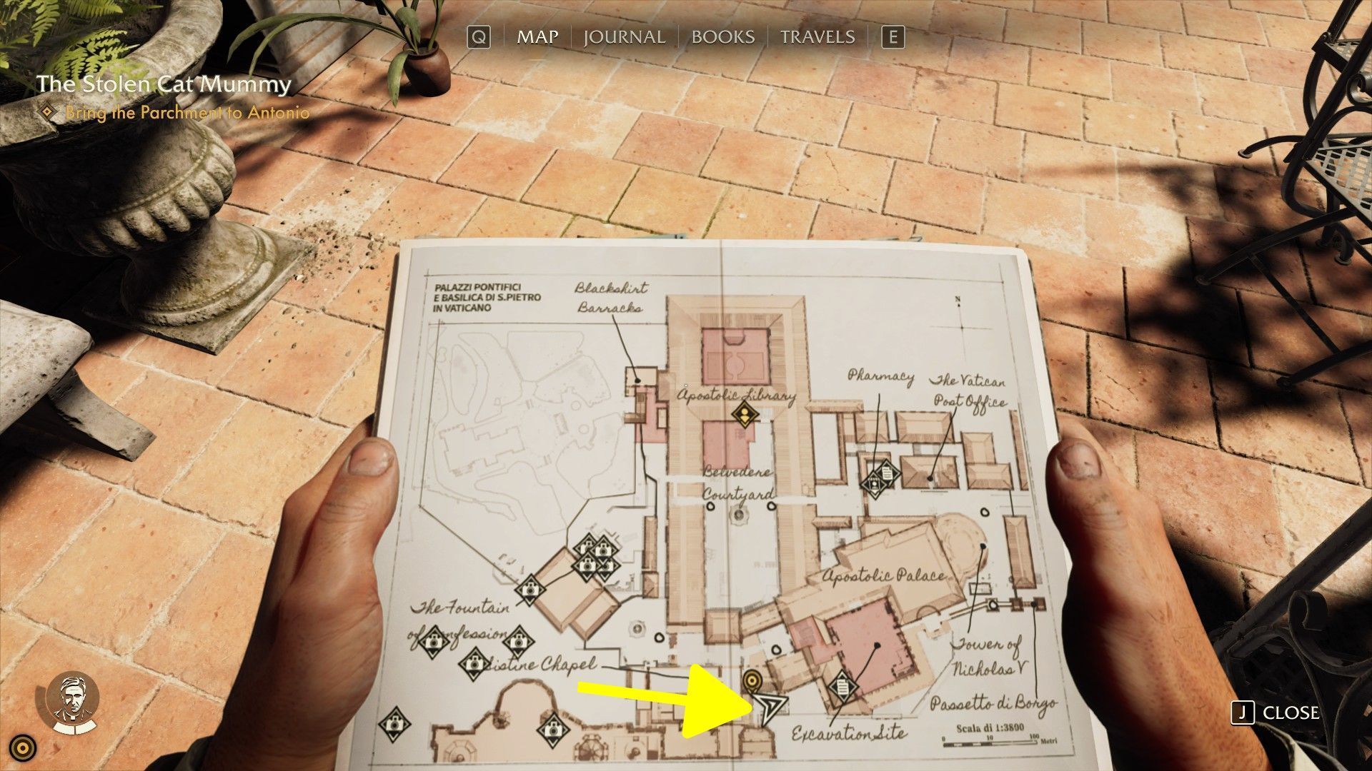 - Po walkach zbadajcie dziedziniec. Mundur Czarnych Koszul jest przed namiotem z obrazka i razem z nim pozyskacie również klucz Czarnych Koszul - może on Wam posłużyć do odblokowania wybranych zamkniętych drzwi na terenie Watykanu.