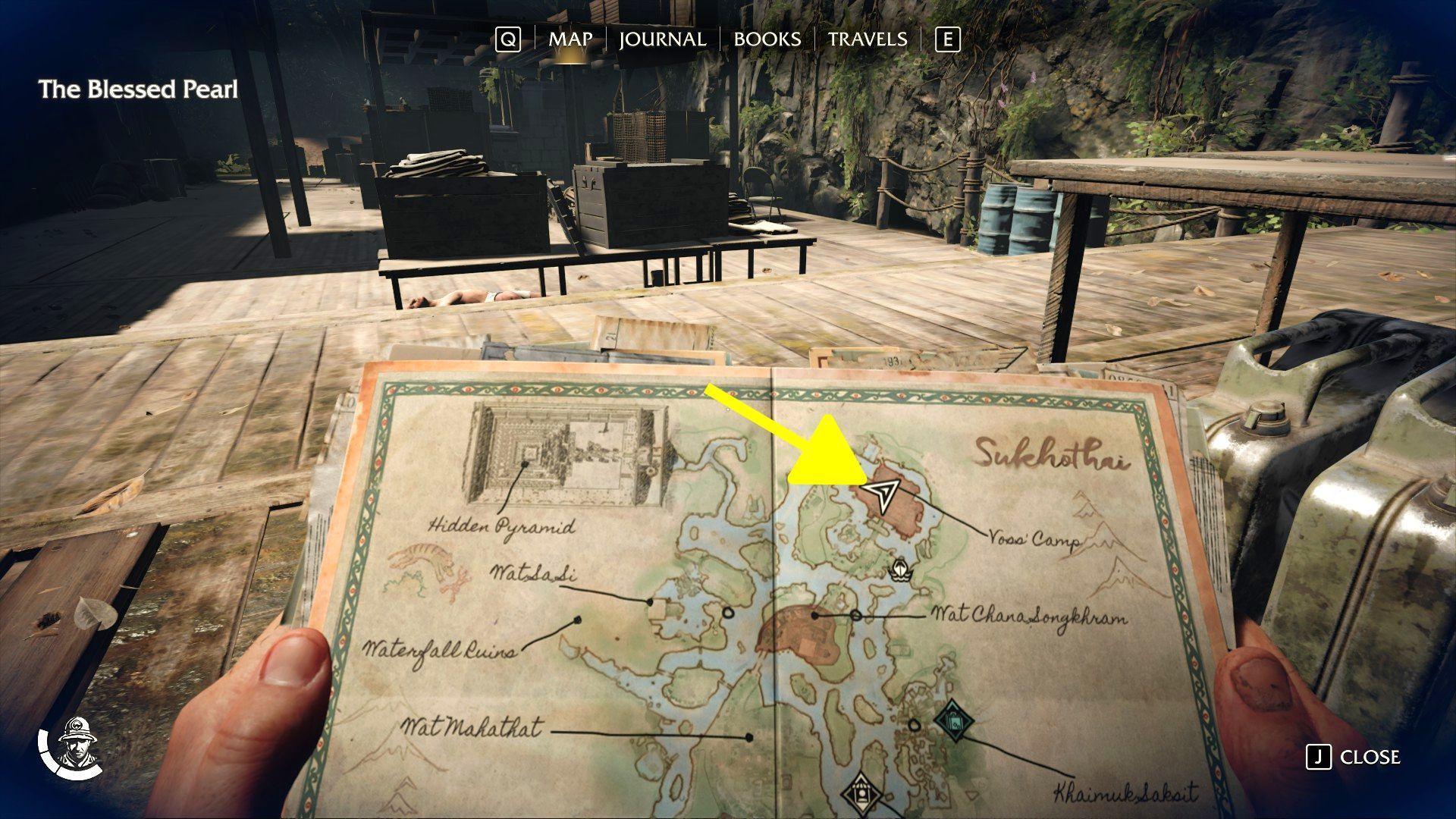 - Wyruszcie do głównego obozu Vossa, który dla przypomnienia jest w północnej części Sukhothai. Stanie się to możliwe gdy tylko uzyskacie dostęp do łodzi i opcji swobodnego podróżowania po głównej mapie Sukhothai.