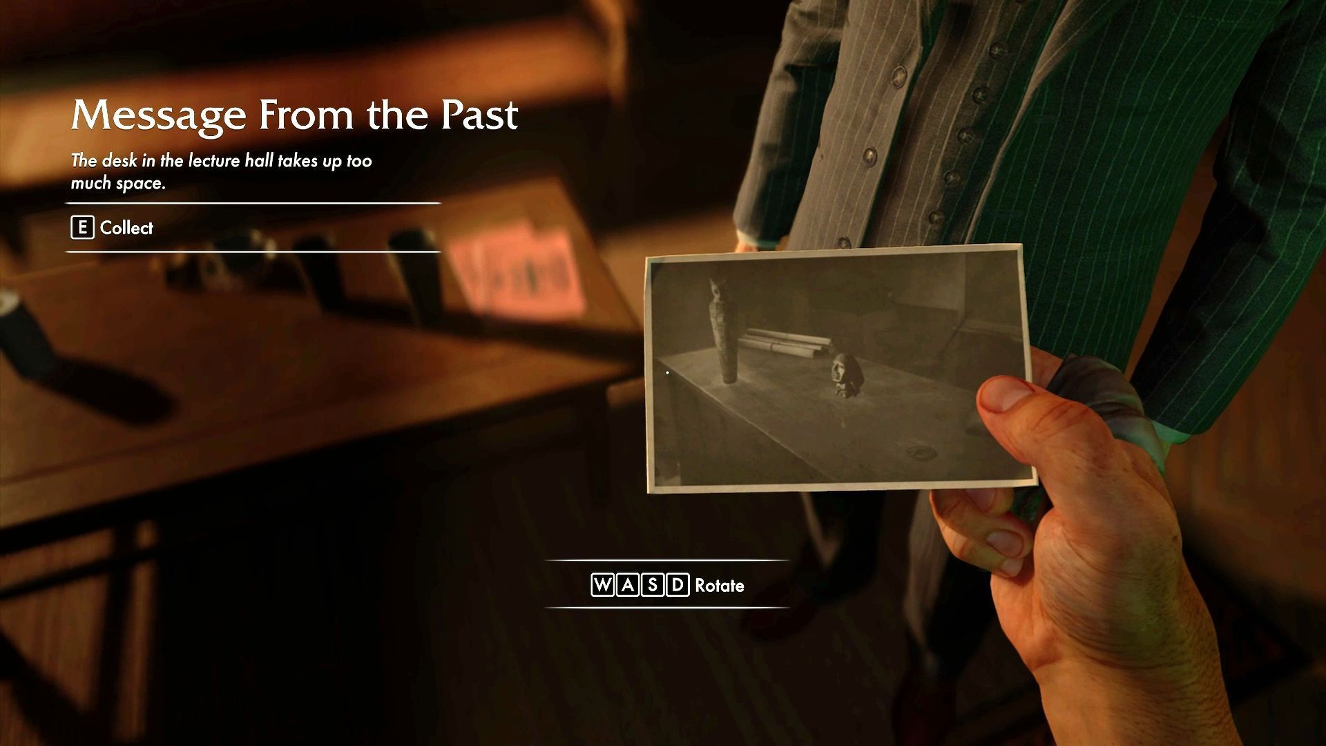 Powróćcie do głównego korytarza i wyruszcie dalej. Po drodze otworzą się kolejne prawe drzwi i wejdziecie do sali wykładowej. Na biurku w sali wykładowej znajdują się trzy białe okręgi - to miejsca do umieszczania artefaktów.
