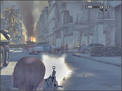 Nad Waszymi głowami ponownie pojawi się wrogi śmigłowiec. Tym razem jednak będziesz mógł praktycznie do woli chować się za znajdującymi się w okolicy barakami. Walka ta nie może jednak trwać nieskończoność, gdyż śmigłowiec częściej będzie zawracał. Warto więc odnaleźć kolejne wyrzutnie rakiet (screen). Dwa takie obiekty znajdują się przy lewym podwyższeniu.