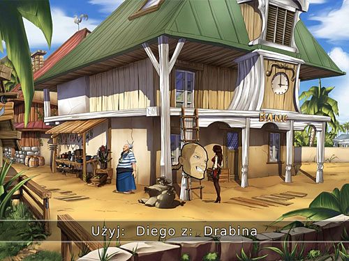 Za pomocą mapy w menu przenieś się w pobliże bram miasta, a stamtąd przejdź na górny rynek. Tu obadaj stojącą przy banku drabinę. Kliknij na niej ikonką symbolizującą Diego, a pirat weźmie ją i powrócicie na Mroczną Plażę.