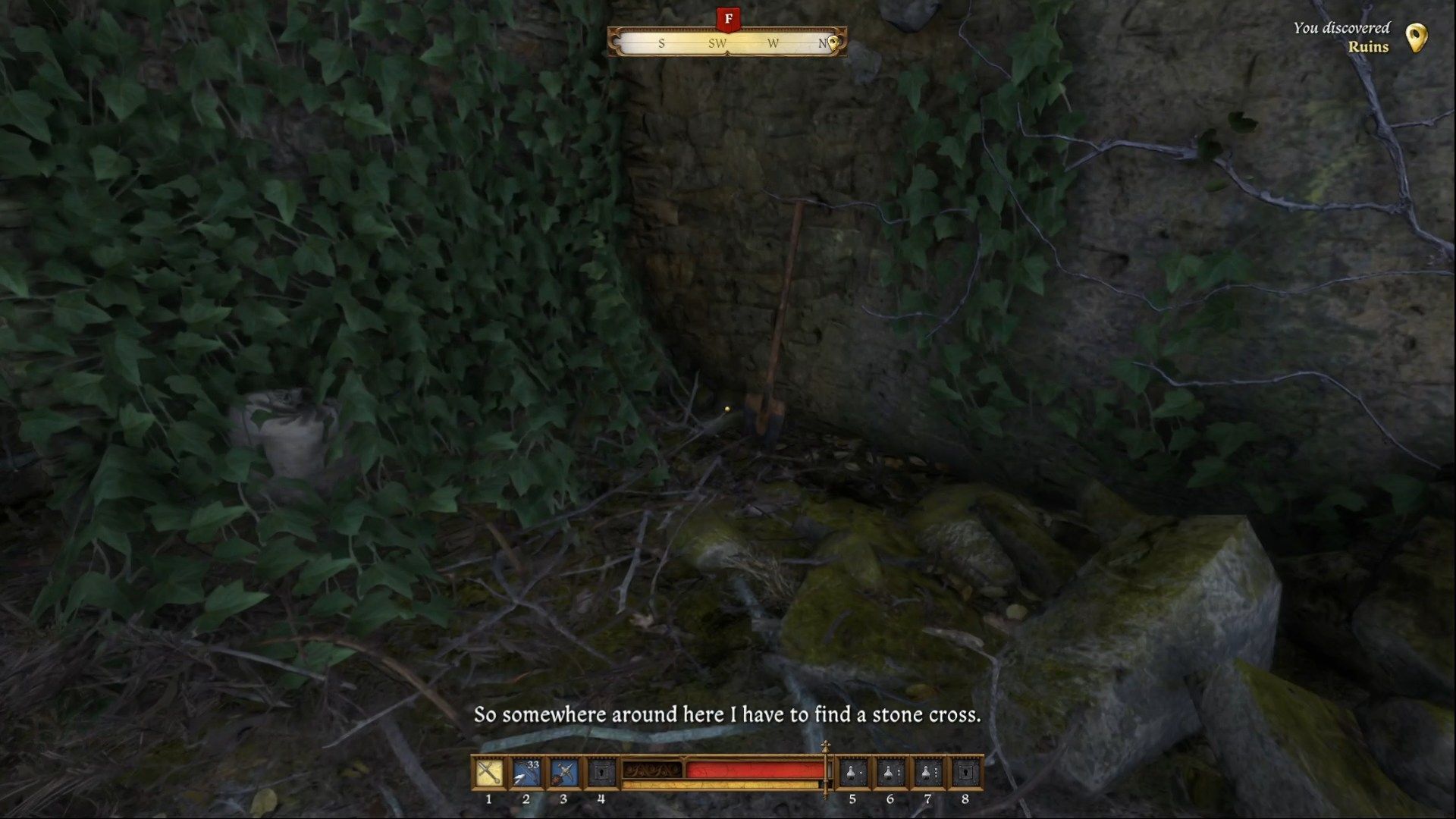 Obok ruin znajduje się fragment zawalonego kamiennego łuku, a pod nim - leżący na ziemi kamienny krzyż. Idźcie w kierunku, który wskazuje czubek kamiennego krzyża. Doprowadzi was on do drugiego krzyża - raz jeszcze idźcie w kierunku wskazywanym przez czubek, aż nie traficie na małą polanę i krzyż zakopany do połowy w ziemi. Zacznijcie kopać (będziecie musieli wielokrotnie wciskać przycisk kopania zanim gra wam na to pozwoli). W ten sposób odsłonicie tunel.