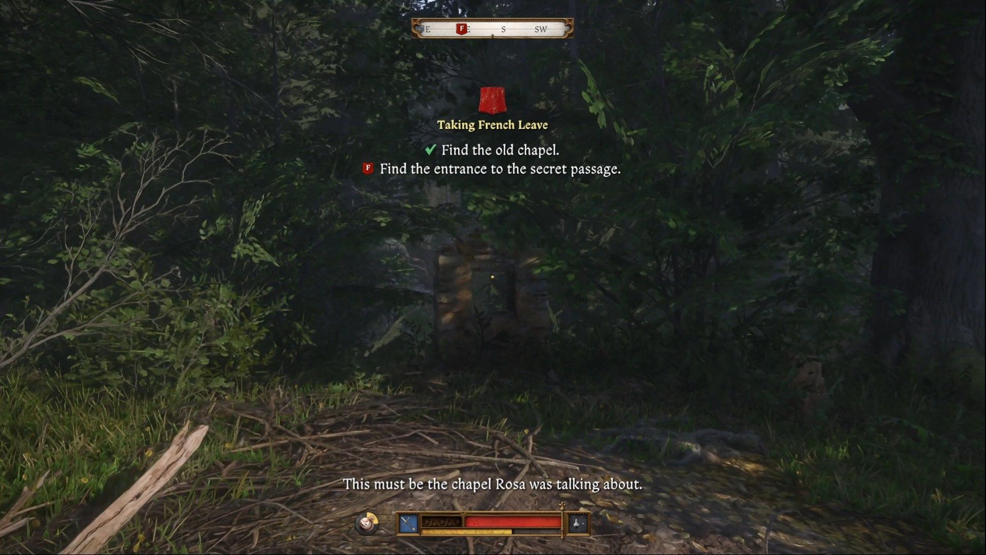 Udajcie się na południe mapy, do stajni nieopodal Maleszowa, i porozmawiajcie ze stajennym Hasztalem. Zgodzi się on wam pomóc - jeśli zdradzicie mu, gdzie jest ukryte przejście, pozwoli wam także zabrać nieco wyposażenia ze swojej osobistej skrzyni. Udajcie się do pobliskiego lasu, obok kapliczki na drodze. Wśród drzew znajdziecie jeszcze jedną, starszą, kamienną kapliczkę - spójrzcie przez małe okienko w kapliczce i udajcie się w tym kierunku. Znajdziecie tam stare ruiny, a wśród nich, obok pozostałości ściany, szpadel i worek z miksturami przydatnymi do skradania się.