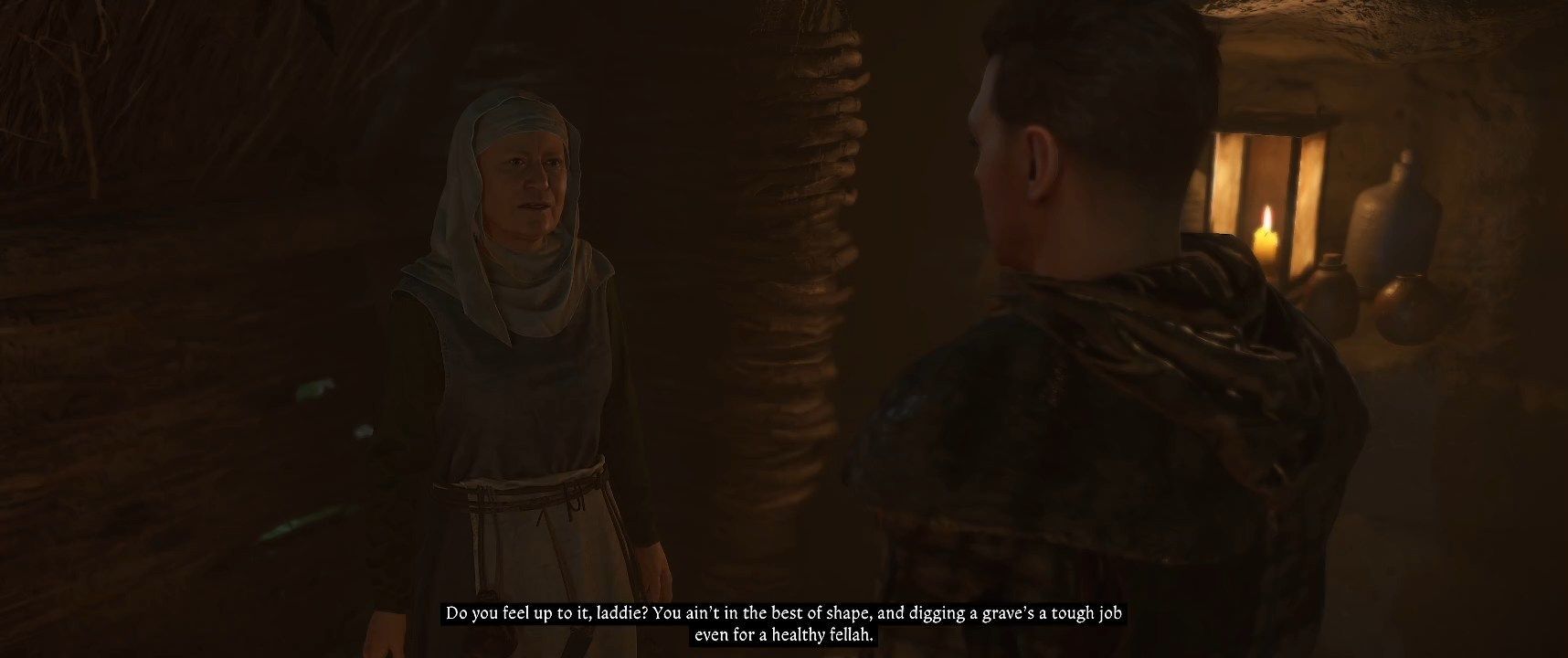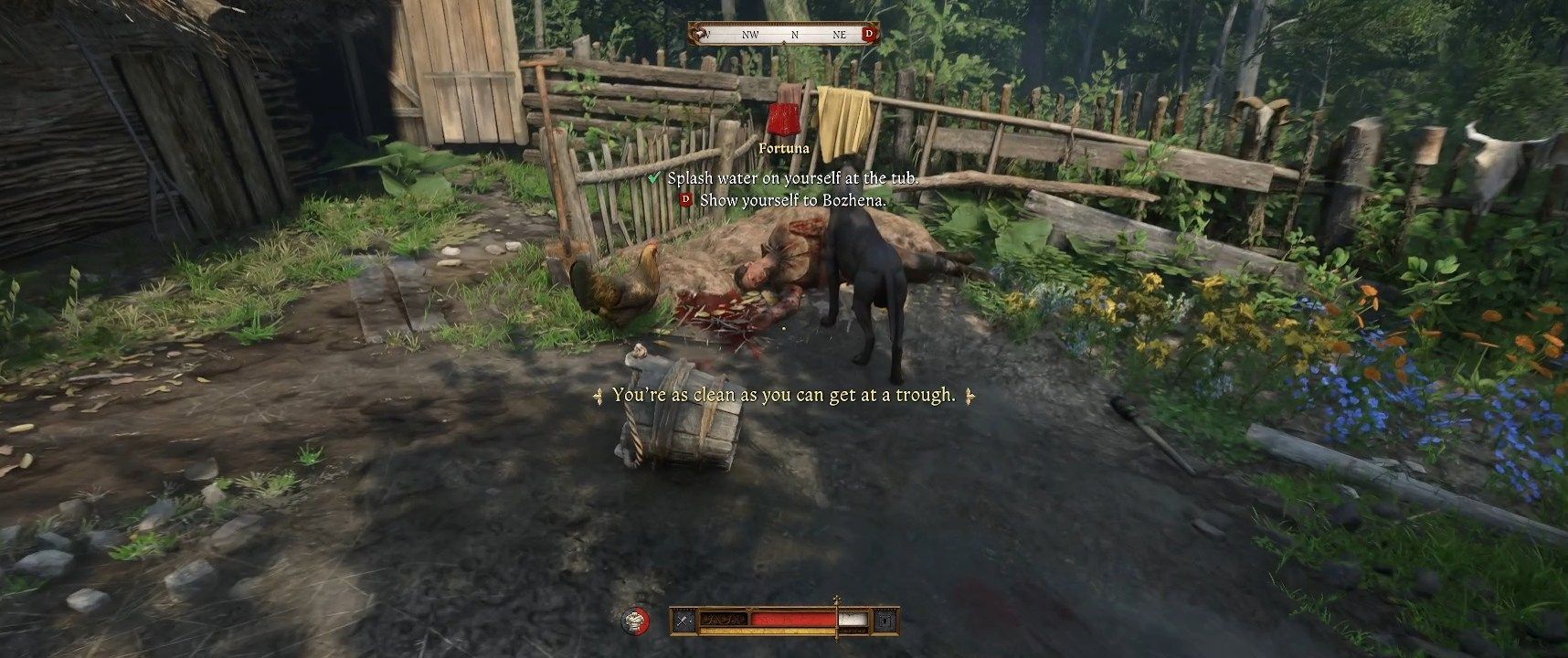 Zadanie rozpoczniecie niesieni przez Jana Ptaszka. Wybierajcie dowolne opcje dialogowe, oglądając zwidy, przez które przechodzi ciężko ranny Henryk. W końcu dotrzecie do chaty zielarki Bożeny. Po przerywniku filmowym obudzicie się następnego dnia - tym razem to Jan potrzebuje waszej pomocy. Najpierw musicie jednak w pełni dojść do siebie. Otwórzcie ekwipunek i użyjcie czterech bandaży by zatrzymać krwawienie tułowia. Następnie podejdźcie do paleniska i zjedzcie nieco gulaszu z kociołka by zaspokoić głód - możecie jeść kiedy tylko chcecie. Potem wyjdźcie z chaty na podwórko. Leżą tam zwłoki bandyty zabitego przez Jana - przeszukajcie go, zabierzcie i załóżcie jego ubrania, a także zabierzcie i wyekwipujcie miecz leżący na ziemi tuż obok ciała. Na sam koniec podejdźcie do balii z wodą i umyjcie się.