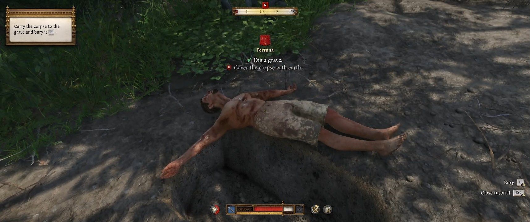 Porozmawiajcie z Bożeną. Poprosi was ona o dwie przysługi - zebranie ziół na wywar leczniczy dla Jana oraz pochowanie zwłok bandyty. Pochówek jest opcjonalnym celem, lecz absolutnie powinniście wykonać go w pierwszej kolejności. Zabierzcie szpadel oparty o płot obok zwłok bandyty, po czym podnieście ciało. Zanieście bandytę ścieżką na północ, wychodząc główną furtką. Kilkadziesiąt metrów dalej znajduje się skupisko miękkiej ziemi, gdzie możecie wykopać grób. Odłóżcie zwłoki na ziemię, wykopcie dół i zakopcie ciało, po czym wróćcie do Bożeny.