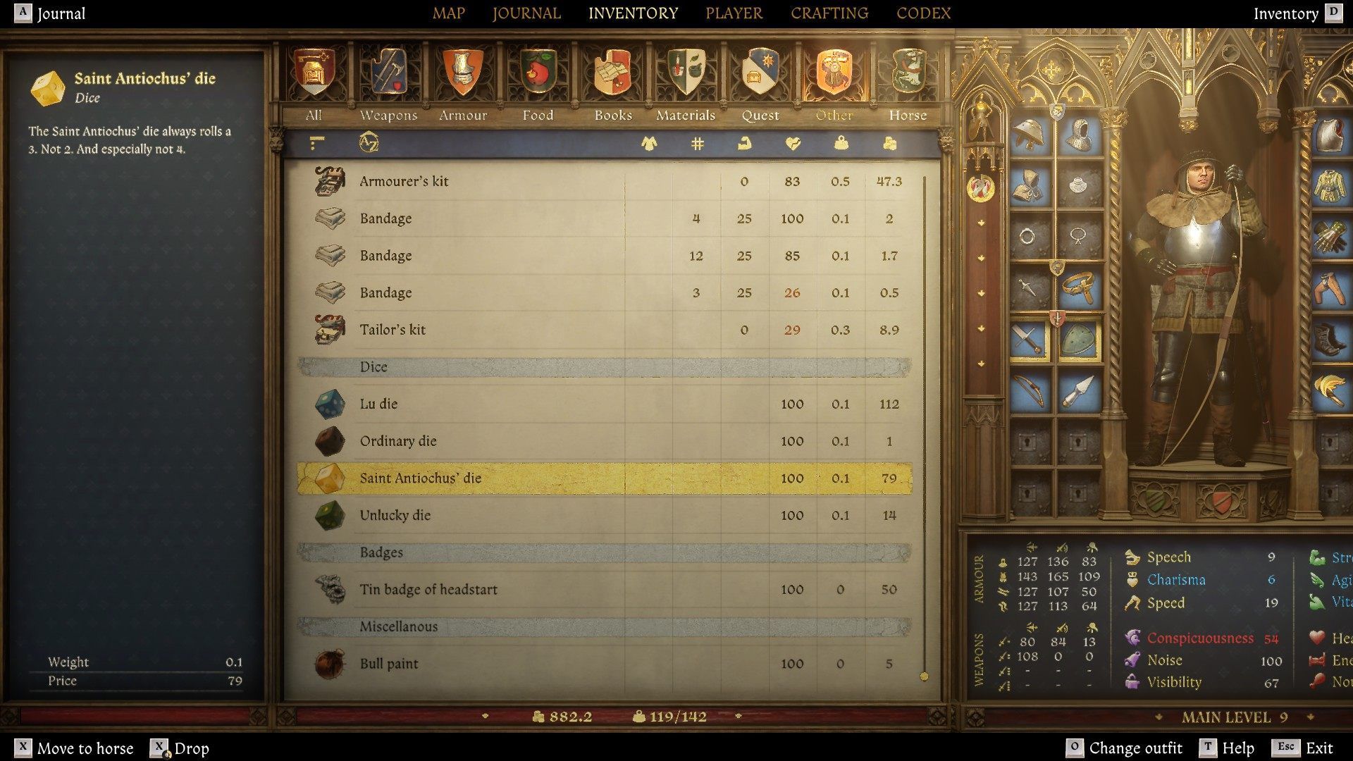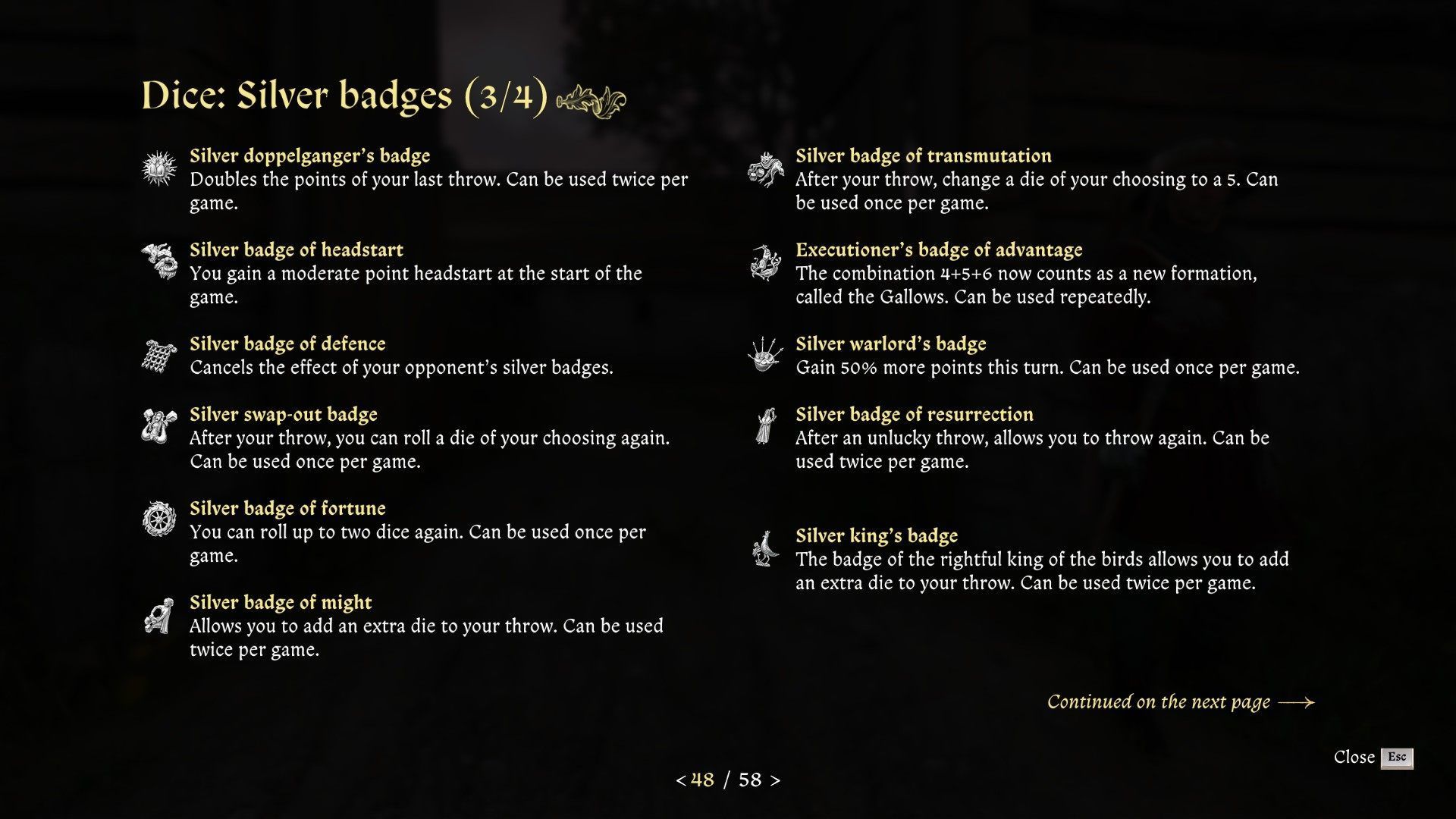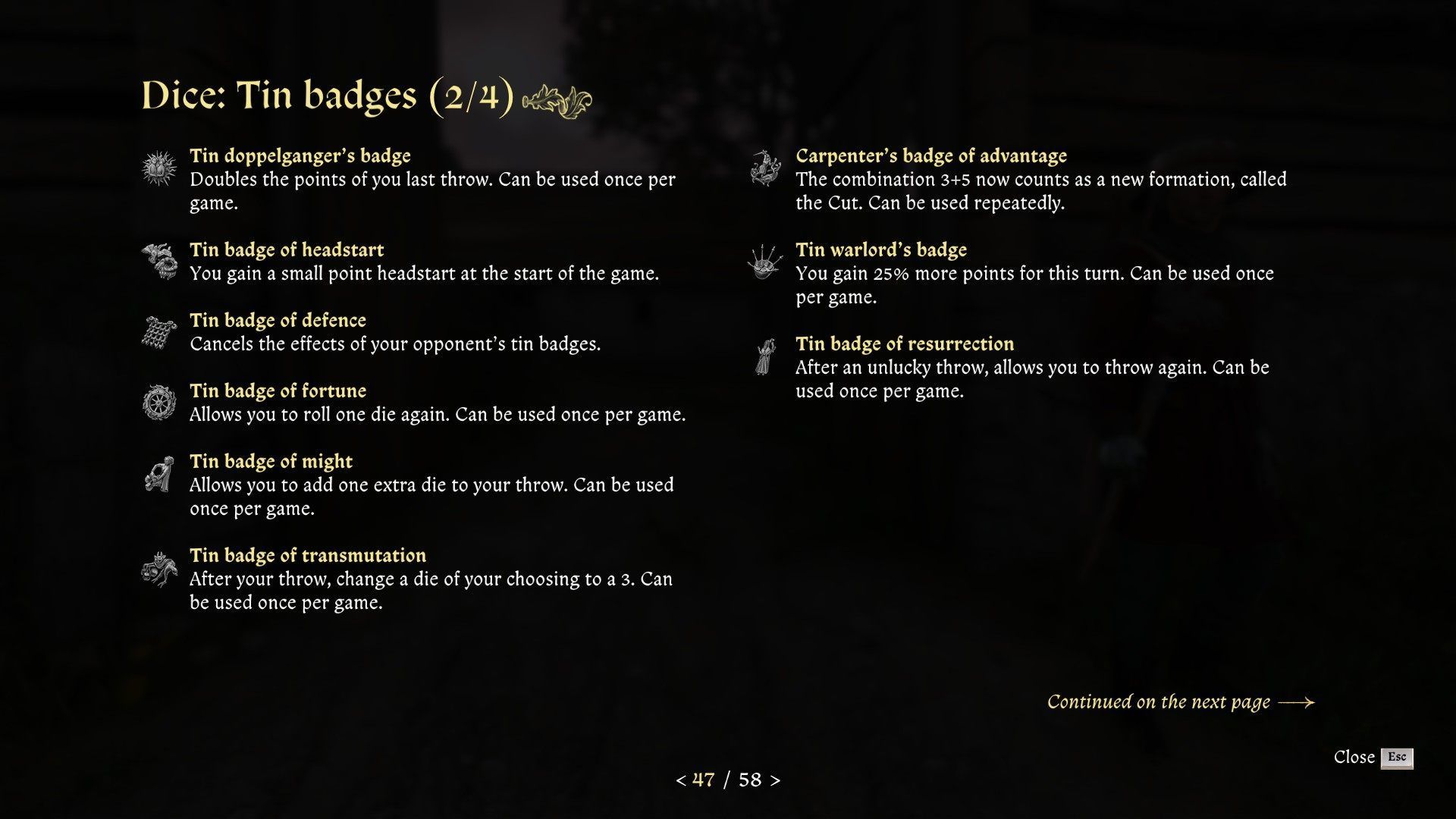 W czasie swoich wojaży po Bohemii, na pewno natraficie na różnego rodzaju kostki o specjalnych właściwościach. Podglądając ich opis w ekwipunku możecie zobaczyć, czym się charakteryzują. Przed każdą grą, możecie dokładnie wybrać zestaw kości ze swojego ekwipunku.