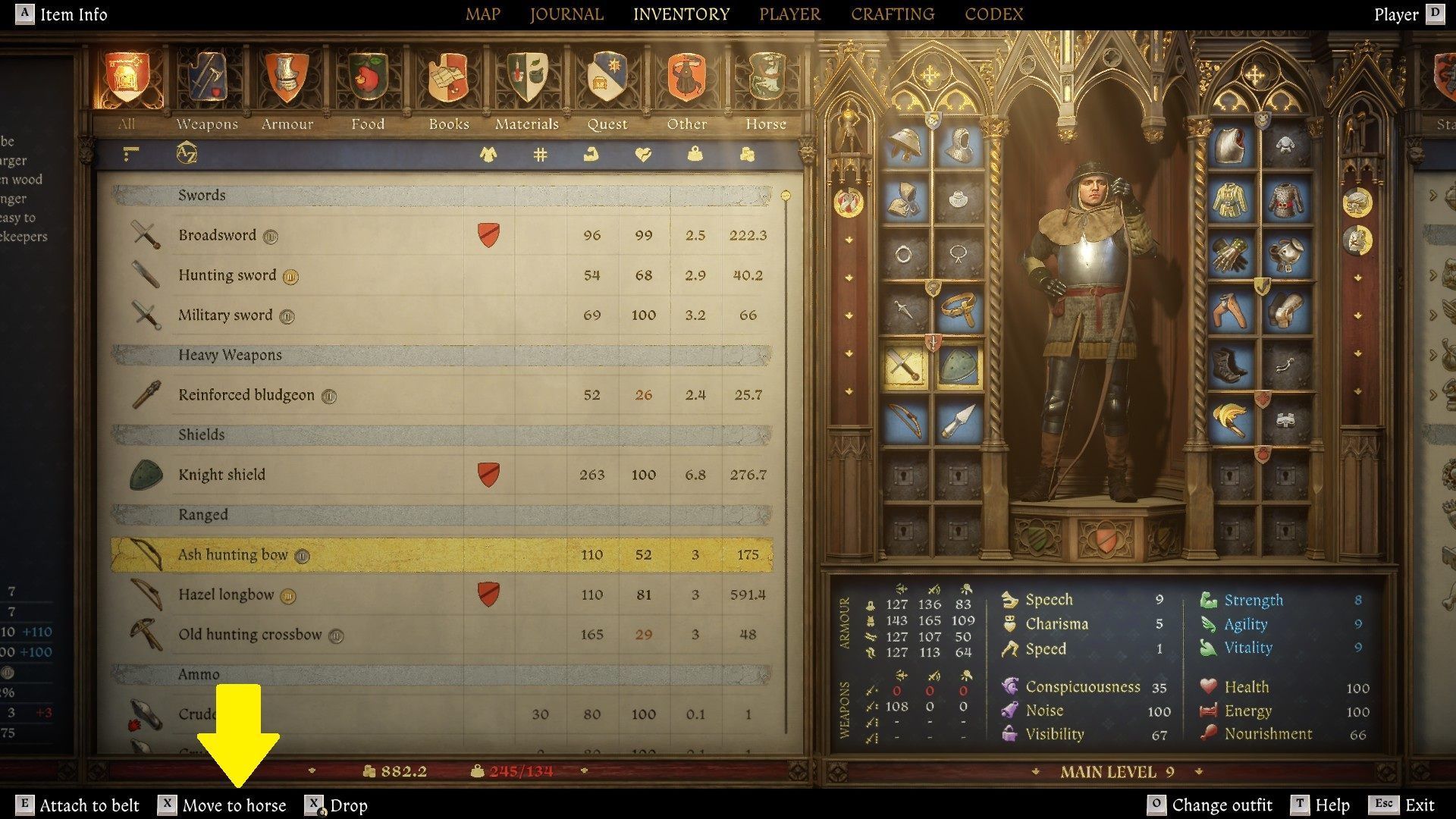 Najprostszym sposobem na odciążenie bohatera, jest przerzucenie części ekwipunku na konia. By to zrobić, wybierzcie dowolny przedmiot z ekwipunku, a następnie wciśnijcie odpowiedni przycisk opisany na dolnej belce (na klawiaturze jest to X).