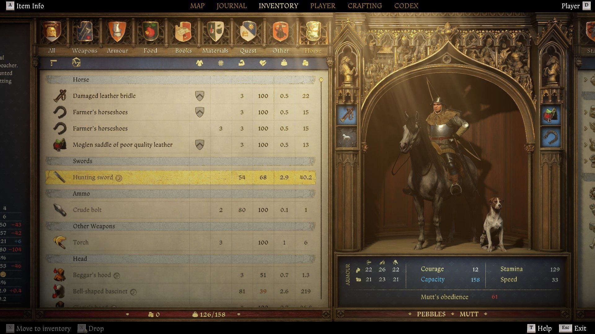 Koń również posiada swój limit udźwigu, jednak ten może być zwiększany poprzez zakup nowego siodła lub dodatkowych juk. Dobrym pomysłem jest trzymanie w ekwipunku konia rzadziej używanych przedmiotów, takich jak zapasowe stroje czy zestawy naprawcze.