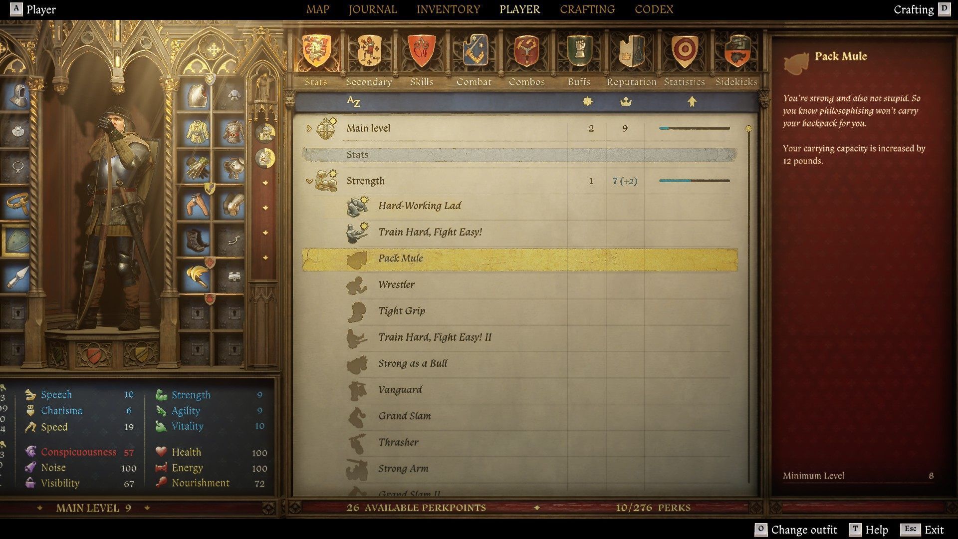 - Pracowity chłopak (Siła, Poziom 6) - znacząco ułatwia przenoszenia ciał, worków oraz innych ciężarów. Dodatkowo, zwiększa udźwig o 8 funtów.