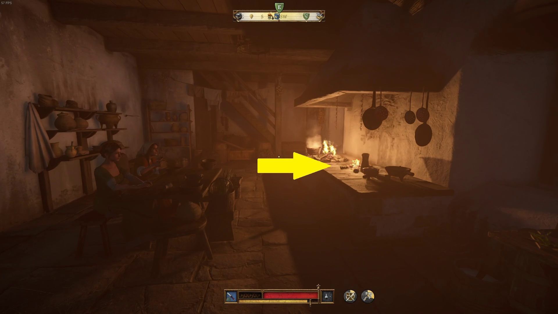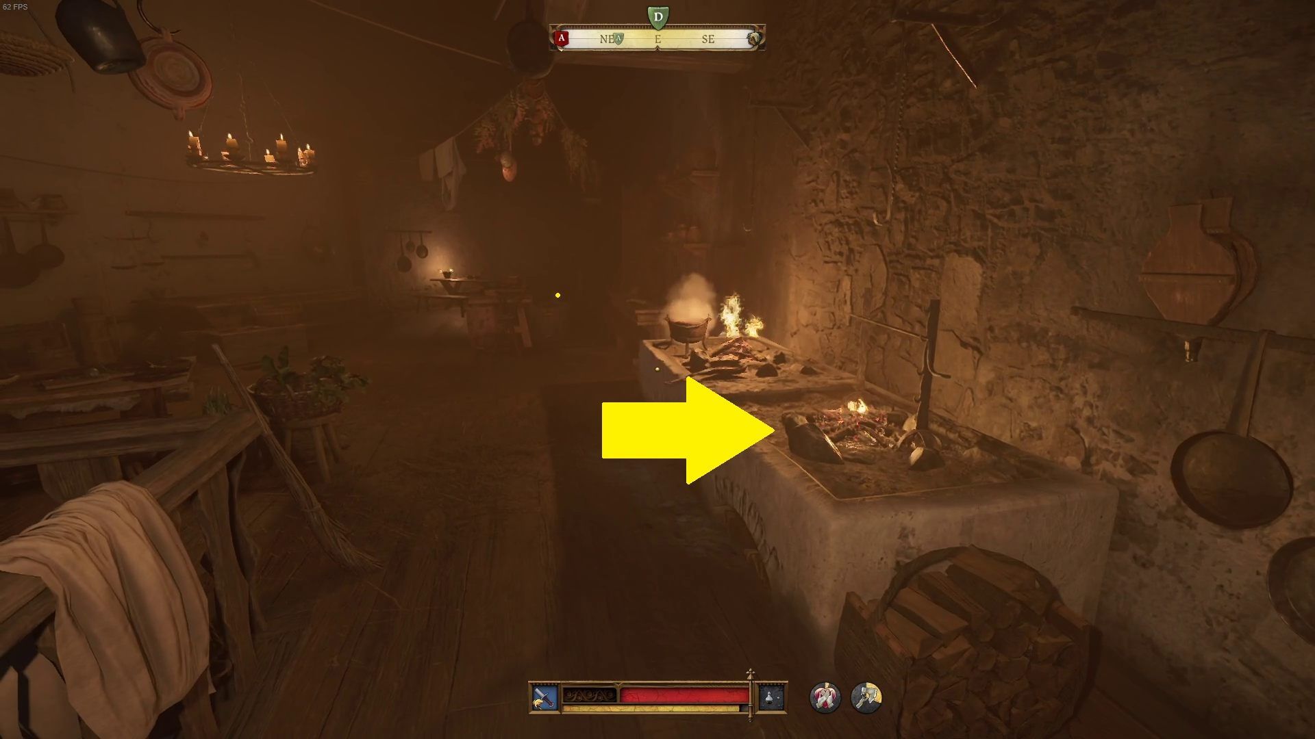 - Pierwsze palenisko znajduje się w kuchni, w której spotkaliście wcześniej cierpiącego na ból brzucha Podkomorzego. Jest to najniższe piętro wieży. By skropić miejsce wodą świeconą, zbliżcie się do paleniska i wciśnijcie przycisk interakcji.