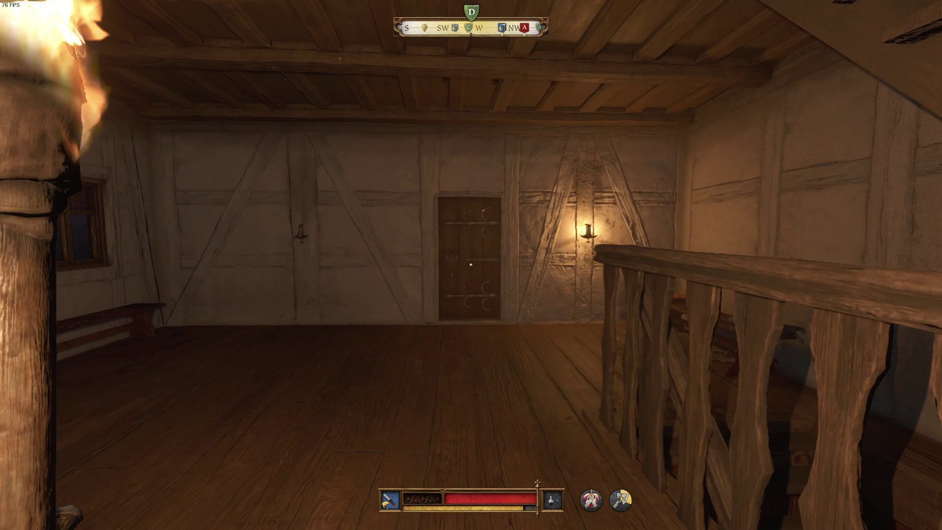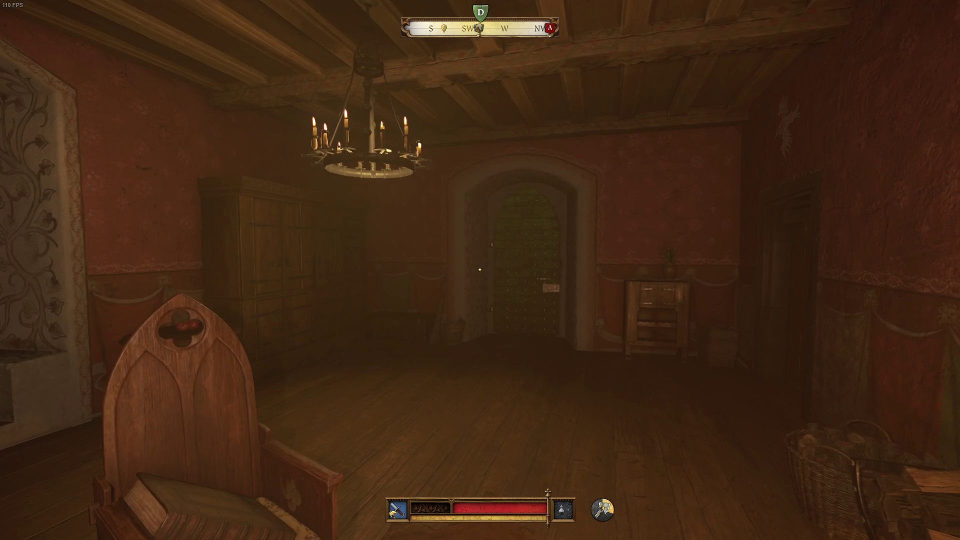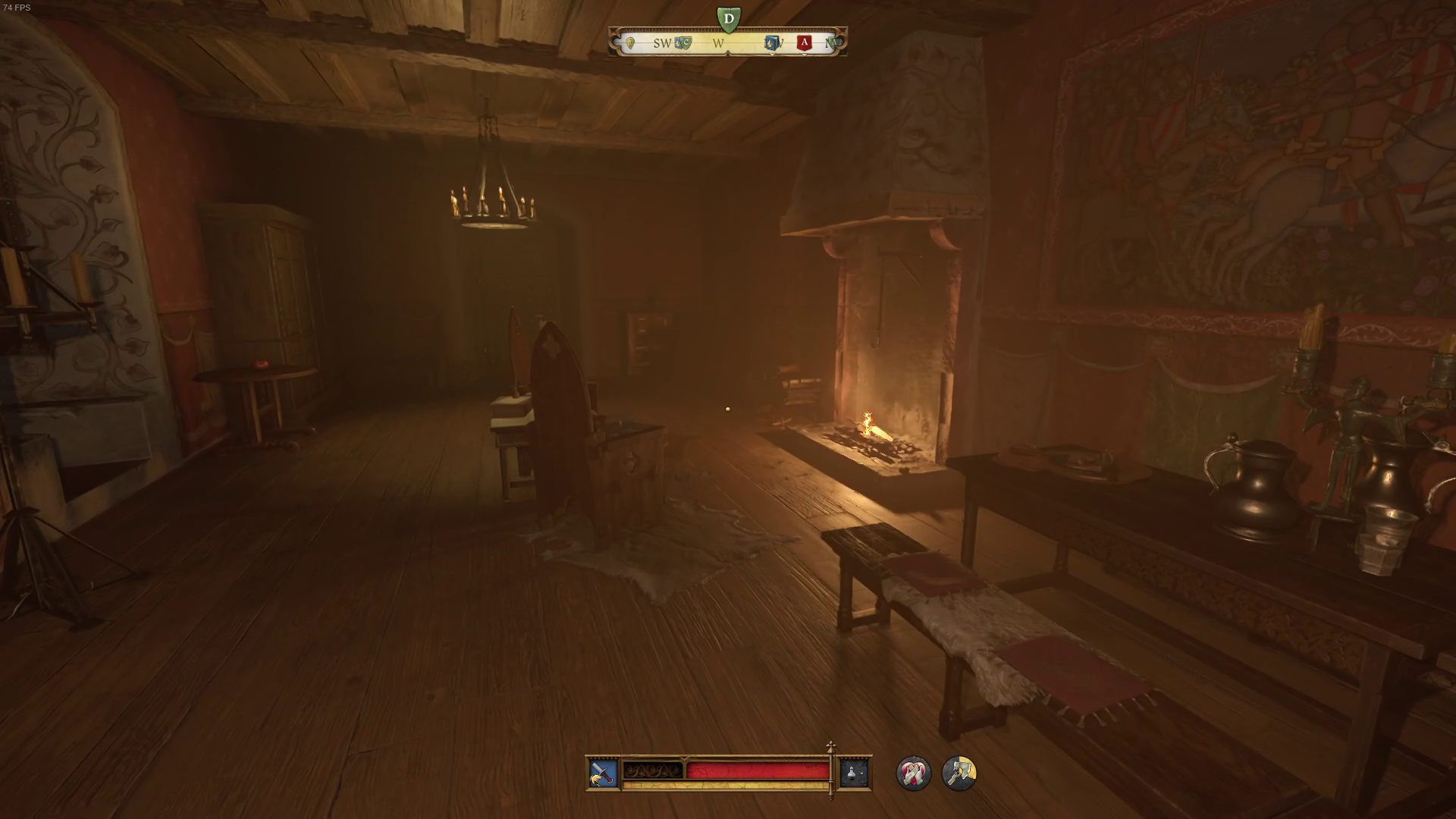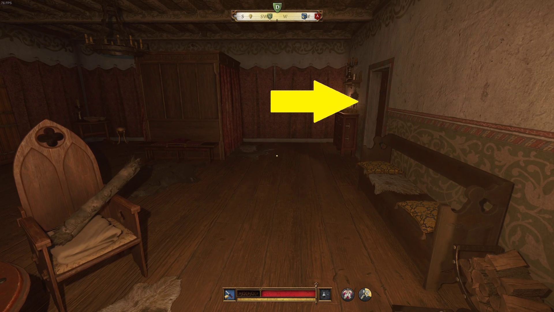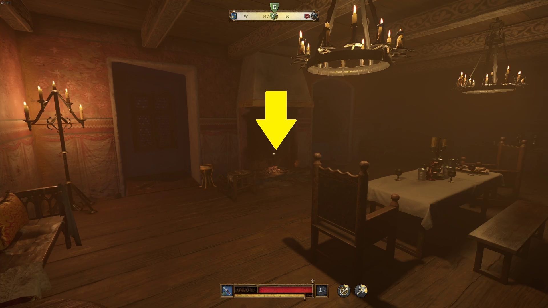 - Wejdźcie po schodach jeszcze wyżej. Przed gabinetem ze stołem alchemicznym skręćcie na drewniane schody po lewej stronie. W kwaterze Podkomorzego znajdziecie czwarte palenisko.