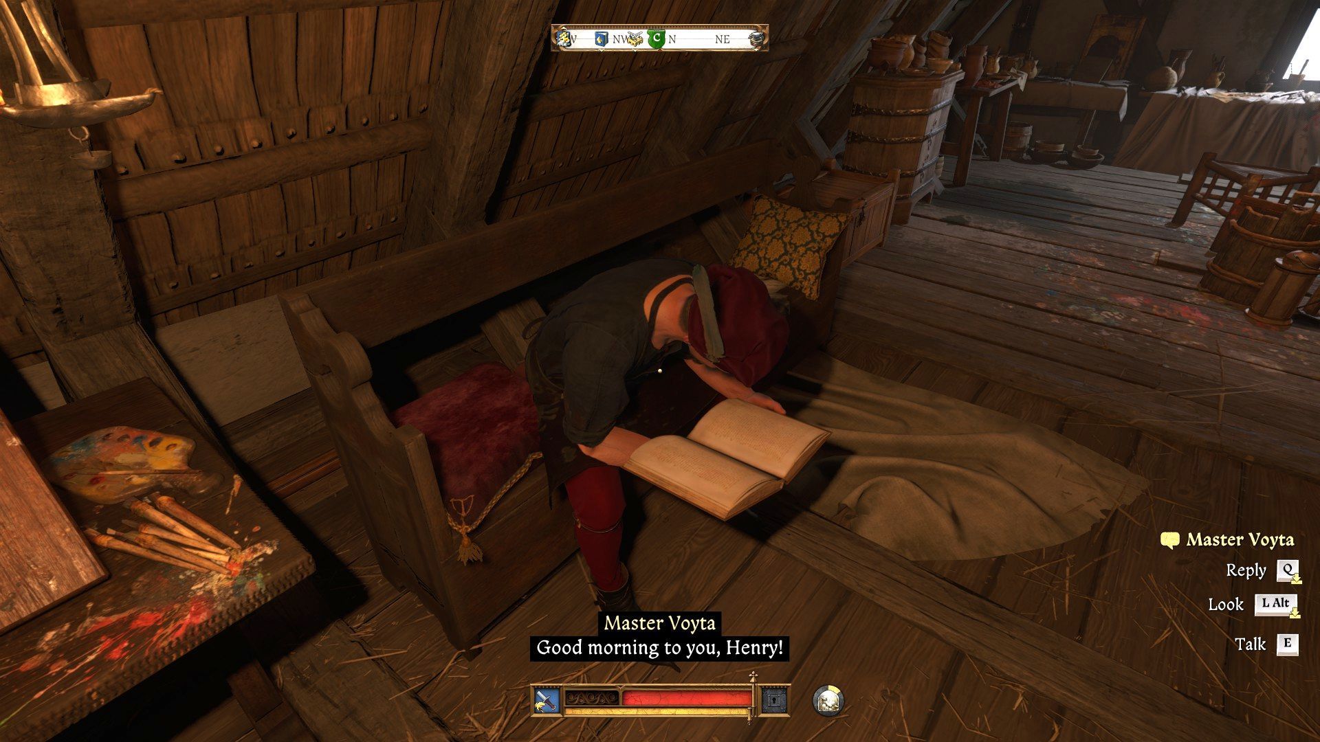 - Wojciech przebywa w zachodniej części zamku, na jednym z wyższych pięter. To jedno z pomieszczeń sąsiadujących z miejscem pobytu skryby w zamku. Możecie powiedzieć prawdę lub skłamać na temat sposobu odzyskania sprzętu malarza.