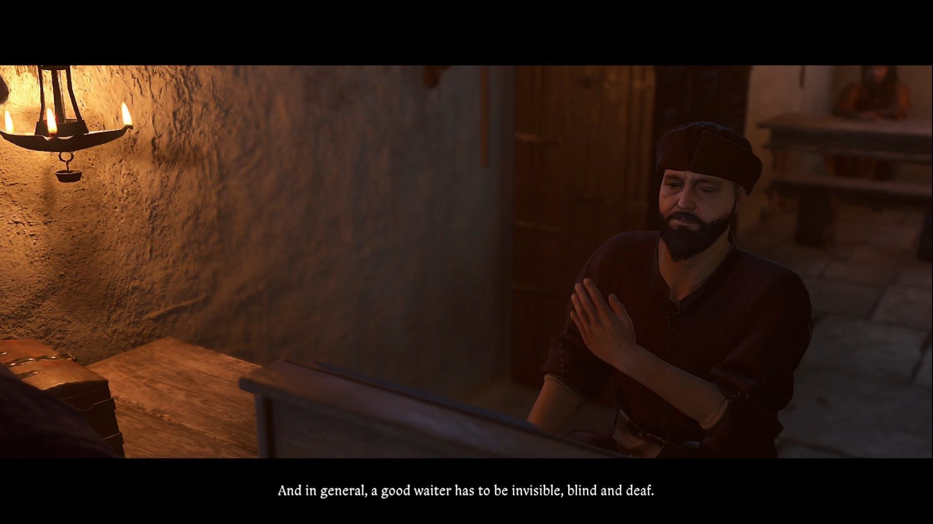 Całe spotkanie spędźcie stojąc obok stołu z dzbanami, uważnie nasłuchując radnych. Okazjonalnie jeden z radnych uniesie rękę i poprosi o wino - biały tokaj (srebrny dzbanek) lub czerwone klasztorne (brązowy dzbanek). Po podniesieniu odpowiedniego dzbanka podejdźcie do radnego, przytrzymajcie przycisk odpowiedzi (Q na klawiaturze) i wciśnijcie przycisk odpowiedzi by nalać wina. Zwracajcie uwagę na imię radnego w prawym dolnym rogu ekranu - jeśli o wino poprosił rajca Adam, grzecznie odmówcie. Po nalaniu wina natychmiast odejdźcie i ponownie ustańcie przy stole z dzbanami. Jeśli nie możecie znaleźć radnego, który poprosił o wino, przesuwajcie się wzdłuż stołów trzymając przycisk odpowiedzi aż nie otrzymacie opcji nalania wina.